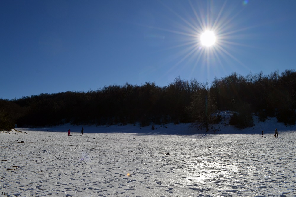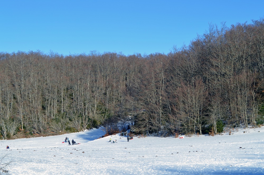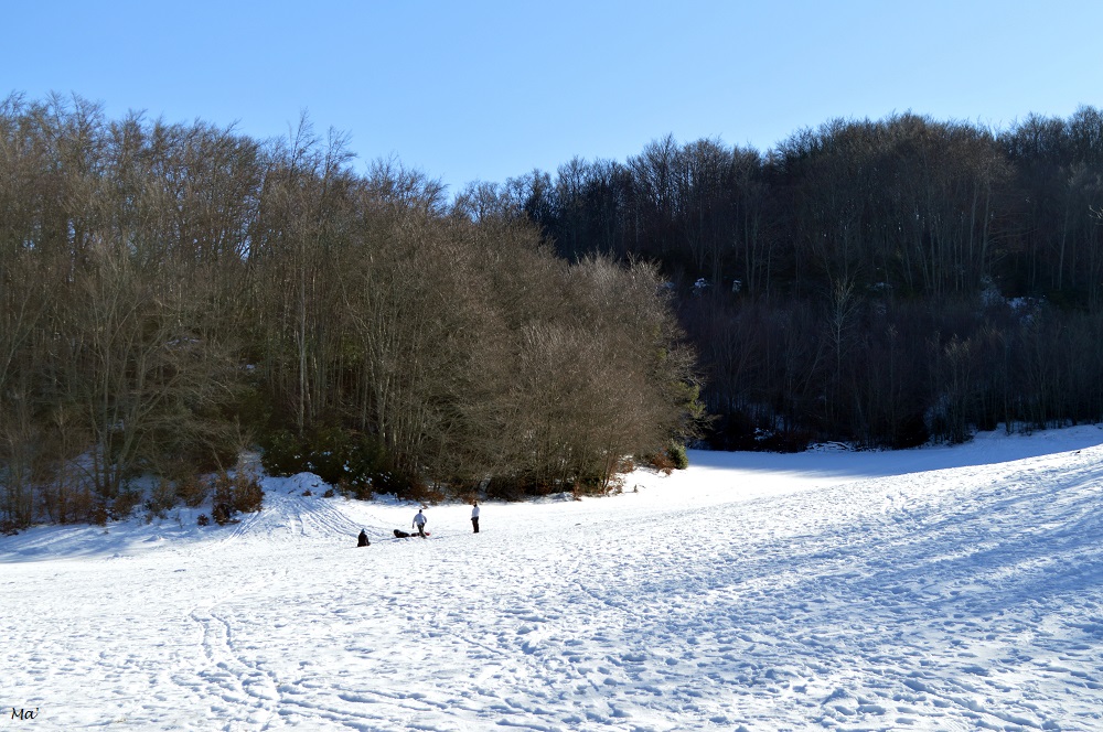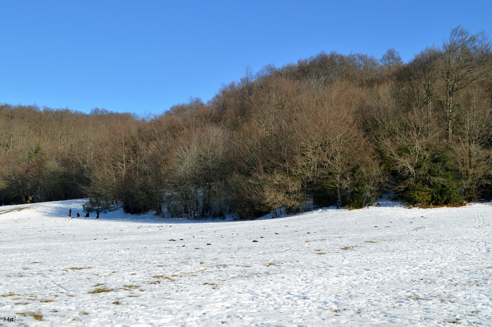 Un peu avant le Col des Limouches (quand on y monte depuis Valence donc), on trouve sur la gauche de la route un petit parking faisant face à un grand champ. Lorsqu’il a neigé, il est impossible de louper l’endroit, surtout les jours sans école, car le champ se transforme alors en immense piste de luge pour le plaisir des petits et des grands… et le parking est vite complet (J’ai eu de la chance car une place venait de se libérer quand je suis arrivée). Le sommet portant la Croix de Chabreille est sur la droite du champ, et ses pentes servent aux glissades.