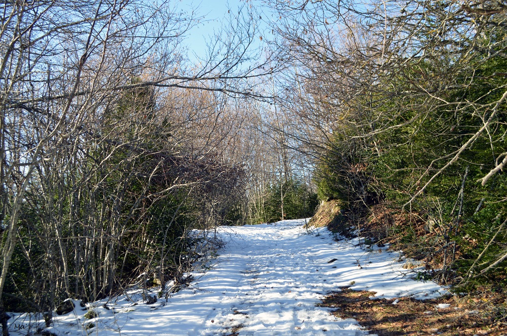 Je décide de continuer un peu à travers les buis, pour prolonger le plaisir de marcher dans la neige en admirant le paysage de tous les côtés. J’hésite à continuer sur le chemin afin de rejoindre la route en contre-bas, mais je choisis finalement de faire demi-tour afin d’éviter d’avoir à marcher au bord de la route trop longtemps.