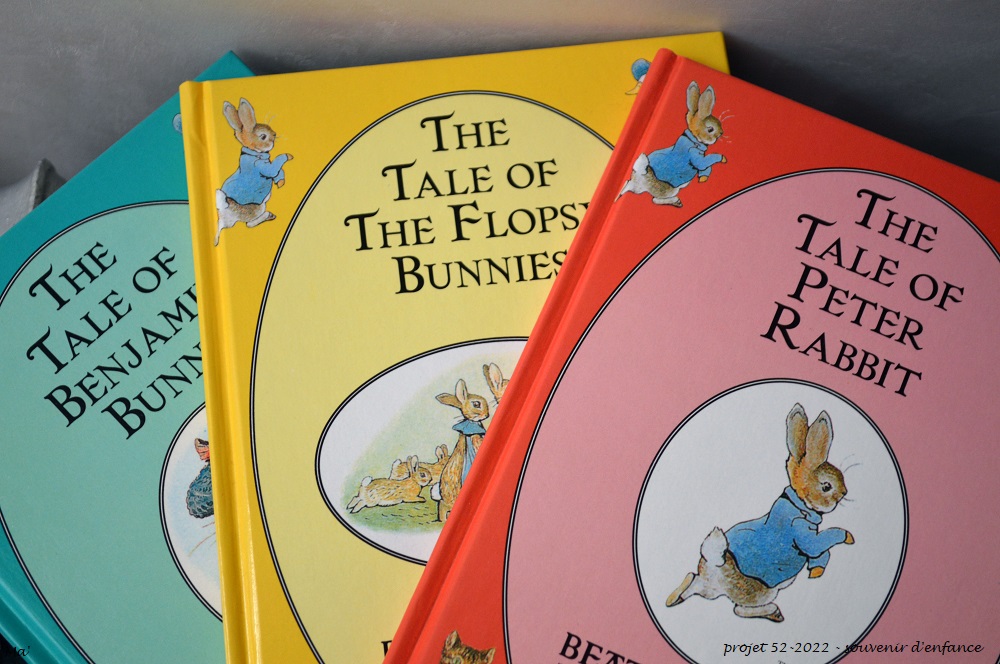 Pour ce souvenir d’enfance, je vous propose ces livres de Beatrix Potter. J’ai découvert les aventures de Peter Rabbit quand j’étais en CE1, chez une amie qui avait reçu un livre en cadeau par la jeune fille au pair venue l’été précédent chez elle. Comme nous ne lisions pas l’anglais, nous nous racontions l’histoire à travers les images ! Lorsque, étudiante, je suis allée quelques jours en Angleterre, je me suis acheté ces 3 livres…