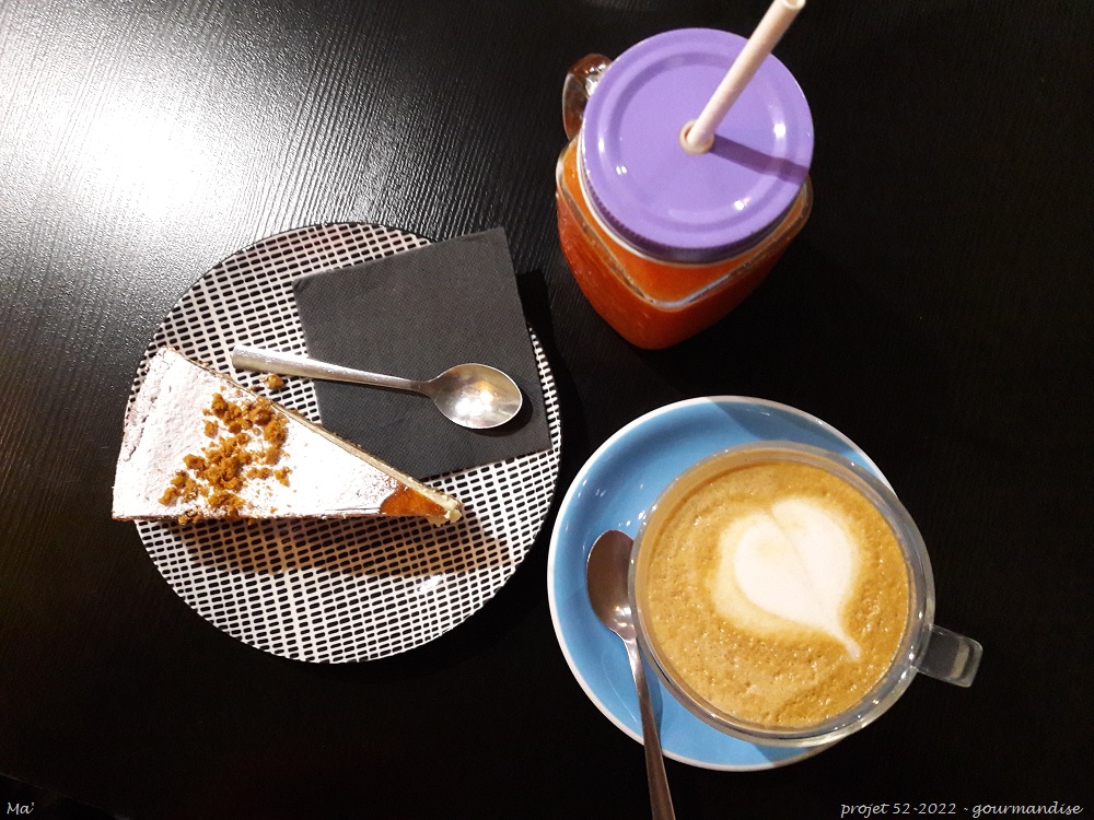 Finalement, j’ai choisi une photo d’un petit déjeuner hyper gourmand pris chez Tamper & Yummy un samedi matin (il y a deux semaines) où il n’était initialement pas prévu que j’aille à Valence. Sur la table : un jus d’agrumes/gingembre fraichement pressé, un ginger latte au lait d’amande et une part de cheesecake…