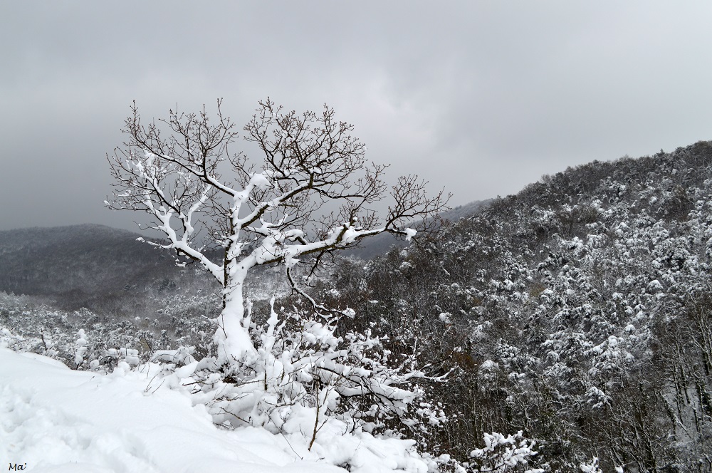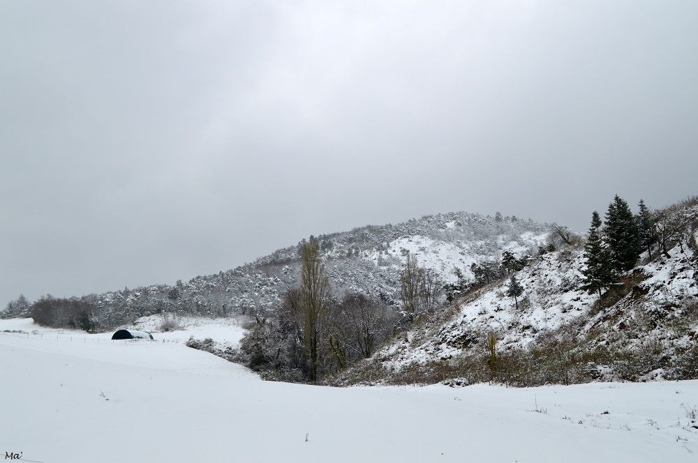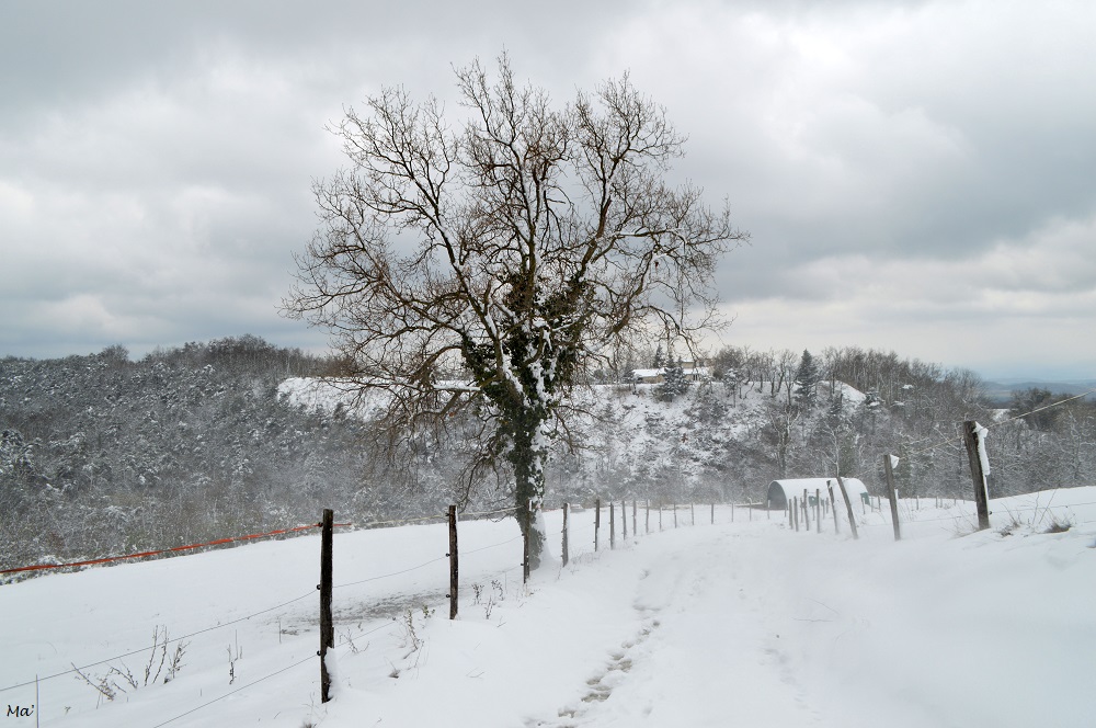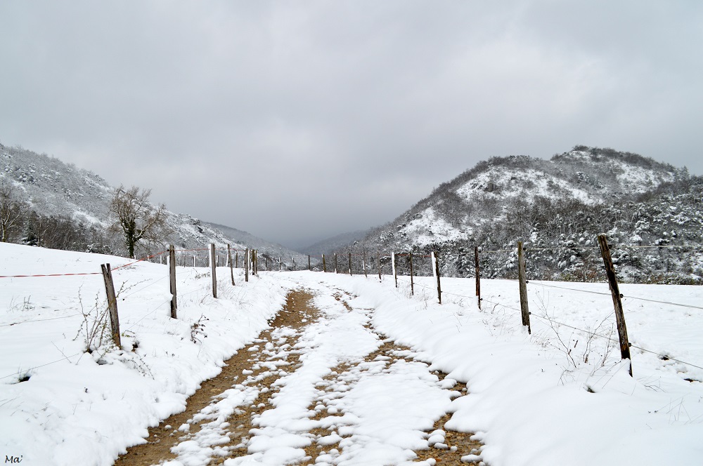 Pour le début de cette sortie, j’ai suivi le même itinéraire que lors d’une promenade faite au printemps dernier. Dans les prés, les chevaux et poneys ne semblent pas perturbés par la couche blanche qui a recouvert leur environnement. Ils me regardent avec curiosité lorsque je passe avant de bien vite trouver leur foin plus intéressant. La piste monte en se faufilant dans le paysage complètement blanc. La couche de neige fait entre 15 et 20 cm si j’en crois mes estimations, mais j’arrive à avancer là où elle a déjà été tassée ou n’a pas tenu. Le mistral balaie régulièrement le paysage, soulevant les derniers flocons tombés et secouant les branches des arbres. Les rafales de vent font tomber des petits paquets de neige (je suis encore plus contente d’avoir ma capuche…), et je m’efforce chaque fois que c’est possible de me mettre dos au vent.