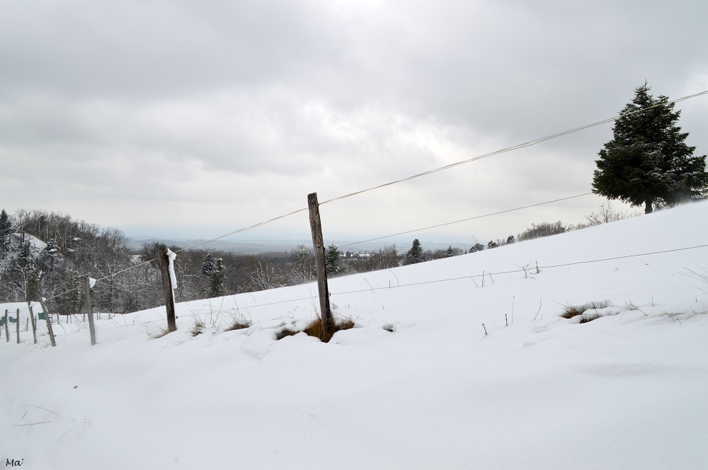 Aussi, en emmenant Mr 1er et Melle 3e au centre équestre, j’ai pris mon sac à dos et mes chaussures de randonnée. Je savais par expérience que la neige y tient souvent bien… et je n’ai pas été déçue ! Environ 1 kilomètre avant d’arriver, la neige était bien présente dans les champs, et en se rapprochant, il devenait manifeste qu’il avait fallu dégager la route avec une lame chasse-neige. Plus haut, le paysage était tout blanc.