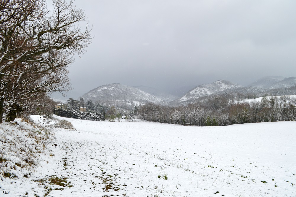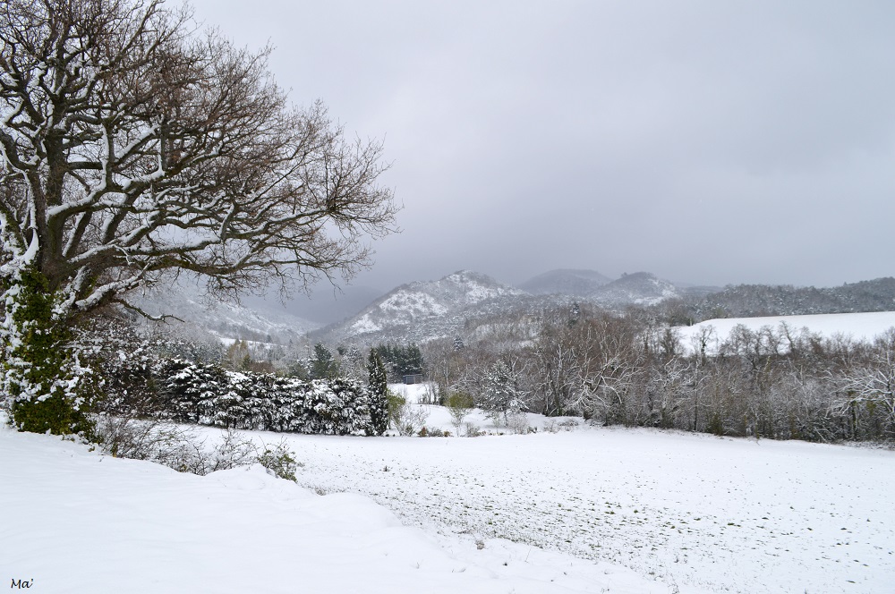 En fin de semaine dernière, une vague de froid a succédé aux journées quasi-estivales que l’on avait connues la semaine précédente, et la neige a fait son grand retour. Vendredi matin, elle tombait légèrement lorsque je suis partie travailler mais ne semblait pas vraiment tenir autour de chez moi. Cependant, en rentrant de Lyon, vendredi soir, j’ai vu que le Vercors était bien blanc jusqu’à des altitudes basses. Dans la nuit de vendredi à samedi, la neige est de nouveau tombée, et en rentrant tardivement d’une séance au cinéma, j’avais pu constater qu’elle tenait même dans mon village de la plaine de Valence. Samedi matin, les toits étaient effectivement blanchis mais le mistral avait tendance à balayer rapidement les flocons. Toutefois, par la fenêtre, je pouvais apercevoir que le Vercors avait gardé sa couche de neige.