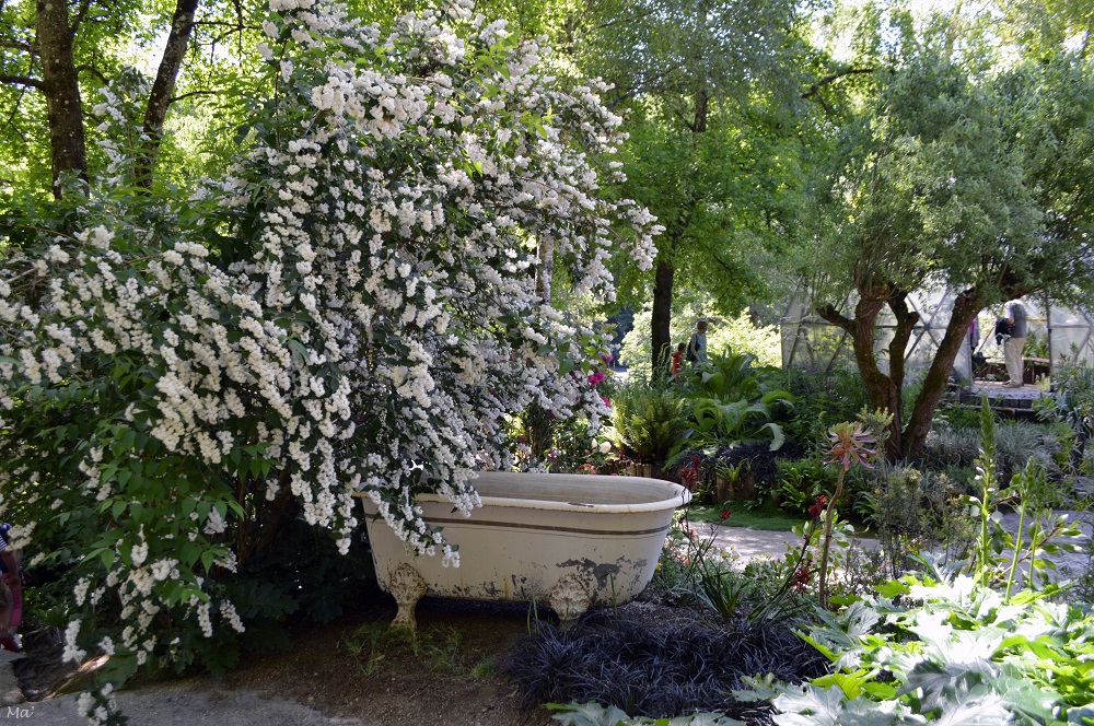 A partir de là, nous avons (plus ou moins) suivi le circuit de visite. Nous traversons et retraversons des ruisseaux. Plantes et fleurs attirent le regard, ainsi que quelques installations plus originales, comme une baignoire végétalisée dans laquelle « nagent » des canards de bain en plastique.