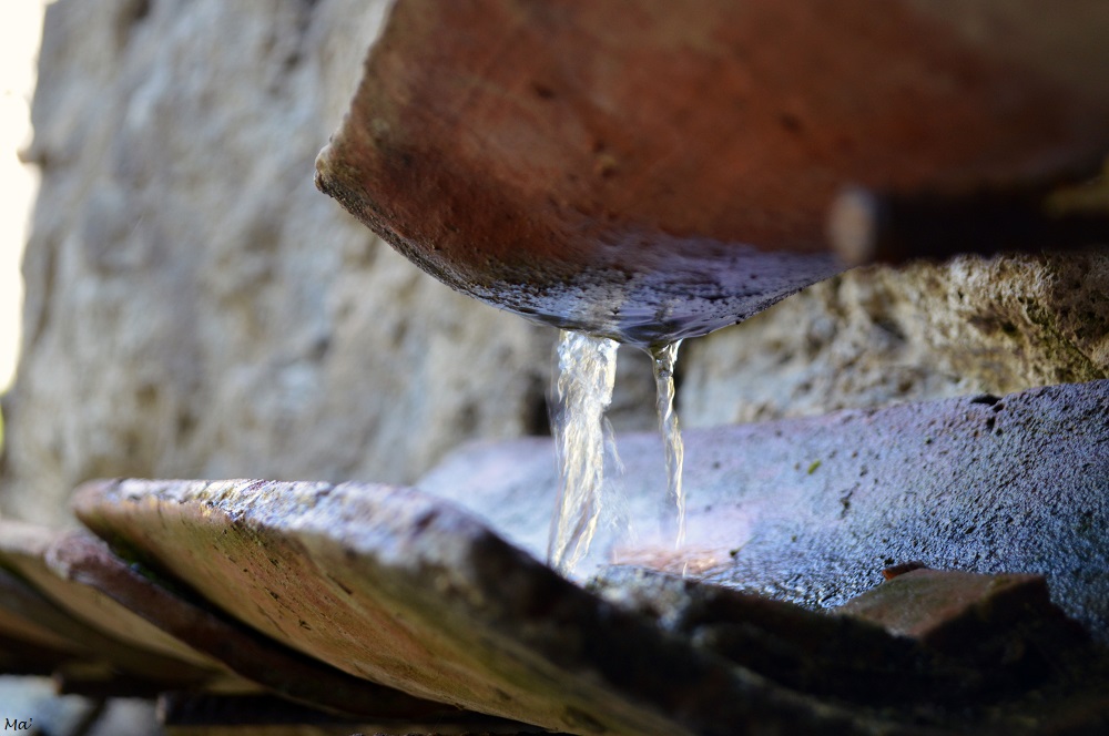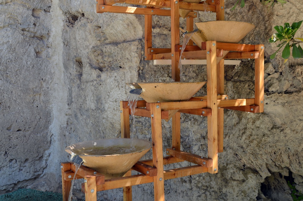 En continuant à longer la paroi de la falaise qui domine le site, nous nous sommes laissées aller à la contemplation du cheminement de l’eau dans deux structures. L’une faite de vases se déversant les uns dans les autres anime un carillon par un jeu de seau et de poulies tandis que l’autre, simple succession de tuiles, permet un moment un peu plus zen, au seul son de l’écoulement de l’eau.