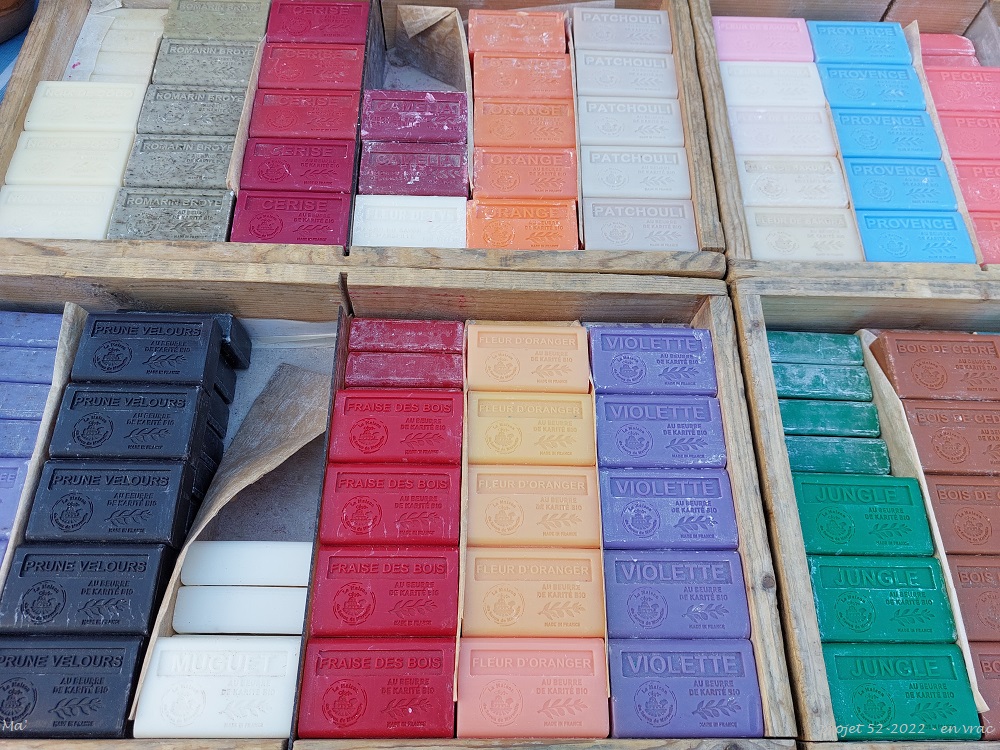 Mais, finalement, l’inspiration est venue sur un marché artisanal comme il s’en tient dans les villes et villages autour de chez moi les soirs d’été. Il y a toujours au moins un savonnier qui vend ses produits en vrac, sans emballage, et l’étal de celui-ci apportait son lot de couleurs (dont on peut se demander si elles sont naturelles, j’avoue ne pas avoir posé la question car j’étais certaine de ne pas acheter, ayant déjà plusieurs pains de savon en réserve à la maison).