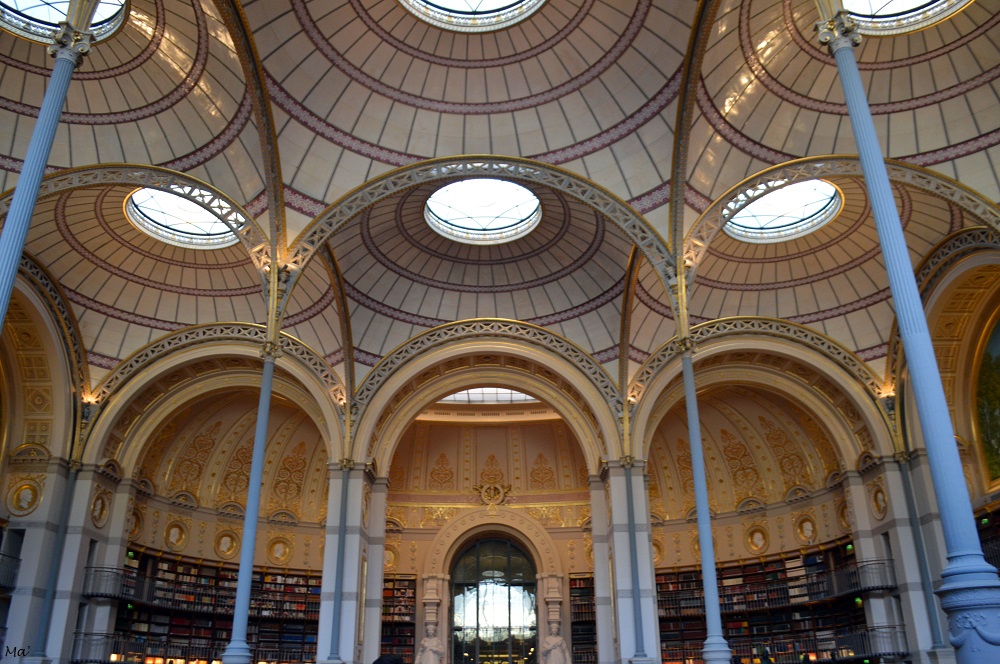 Pour le déjeuner, nous nous rendons rue Sainte Anne car nous souhaitons manger japonais. Je connais plutôt bien ce quartier car j’y ai eu mon bureau parisien pendant 8 ans. Nous choisissons un petit restaurant servant des ramen où j’ai déjà eu l’occasion d’aller. Une fois rassasiées, nous profitons d’être dans le quartier pour aller jeter un œil aux salles de lecture de la BNF Richelieu qui ont rouvert cette année, en passant par le petit square au pied de mon ancien bureau. Nous commençons par aller voir la salle Labrouste, véritable chef d’œuvre architectural construit dans les années 1860. La structure se compose de 9 coupoles portées par de fins arcs métalliques ajourés posés sur des colonnettes de fonte. Les tables de lecture sont pourvues de lampes en opaline. L’ensemble est aérien, élégant. Puis nous nous rendons dans la salle Ovale, construite au début du XXe siècle, éclairée par une impressionnante verrière zénithale et 16 oculi répartis tout autour.