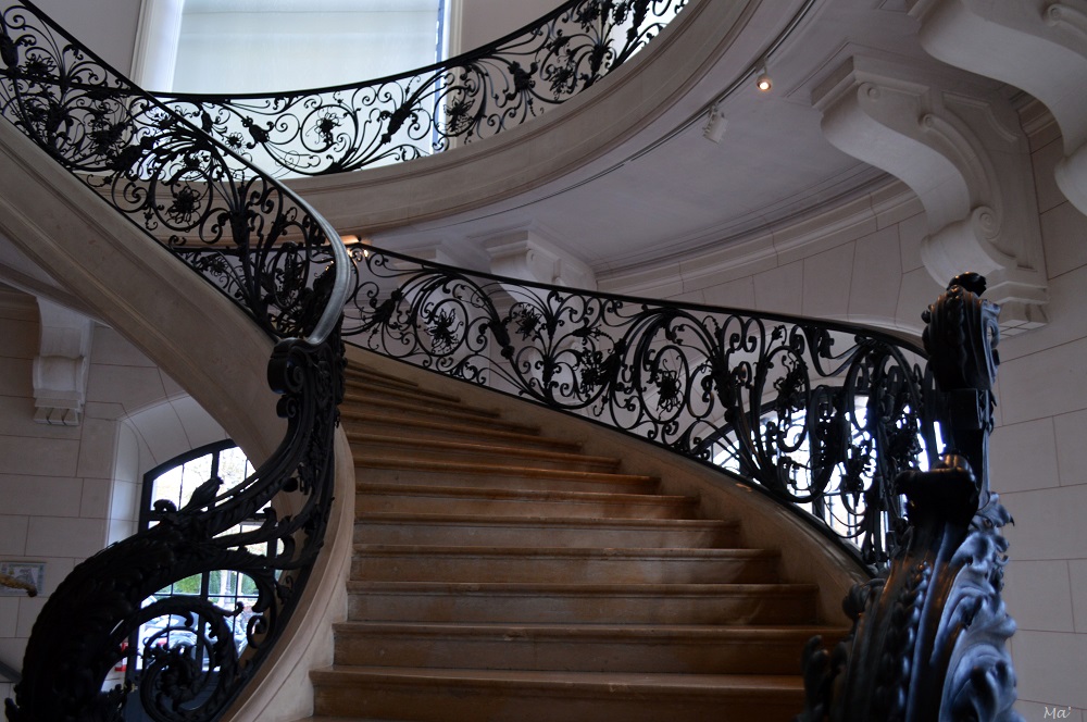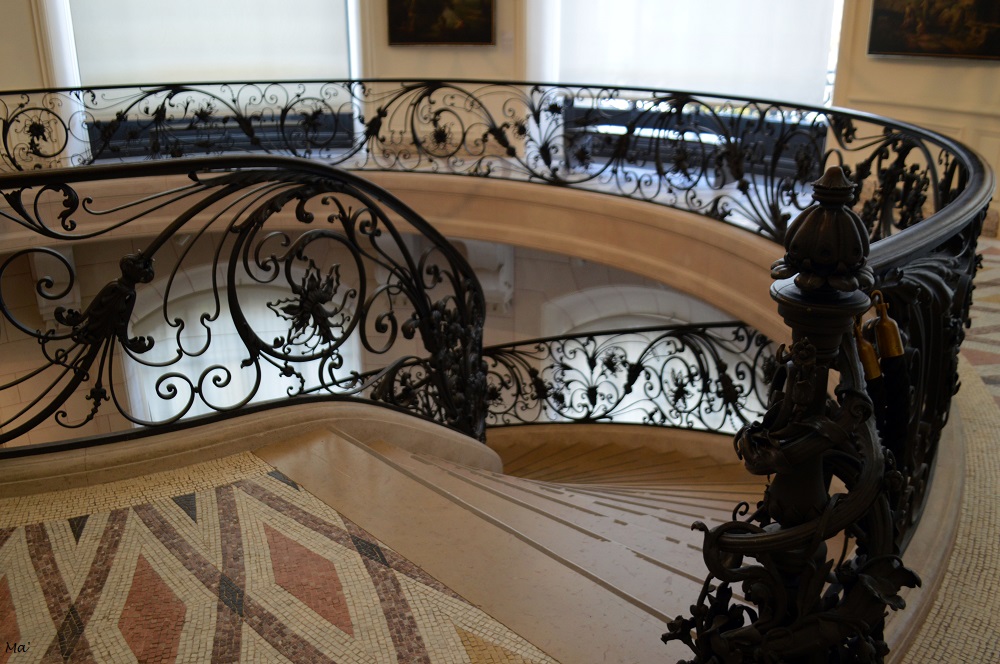 Mosaïques au sol et ferronneries aériennes des rambardes des escaliers