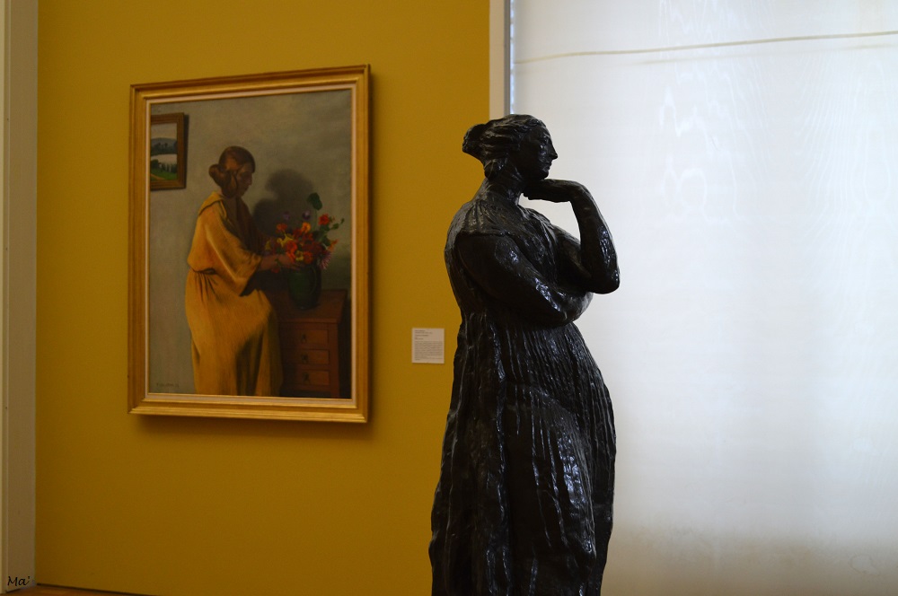 Puis, nous abordons les collections permanentes par la collection Jean Walter-Paul Guillaume qui nous plonge dans l’histoire de l’art de la fin du XIXe siècle et du début du XXe siècle : Renoir, Cézanne, Gauguin, Sisley, Utrillo, Soutine, Marie Laurencin, Derain, Picasso, Matisse, le Douanier Rousseau, Modigliani sont ainsi représentés, parfois avec plusieurs dizaines de tableaux, dont certains très connus (je pense par exemple aux Jeunes filles au piano de Renoir). Enfin, nous gagnons les salles des Nymphéas, pensées par Monet lui-même quand il a fait don de ses toiles à la fin de la 1ère guerre mondiale. Je pourrais dire que cela m’a laissée sans voix, mais ce serait mentir car en entrant dans la première salle, je n’ai pas pu m’empêcher de lâcher un « waouh » ! Si j’avais peur d’être déçue par cette rencontre avec une œuvre majeure dont j’avais souvent vu des reproductions, cela n’a pas été du tout le cas. Composée de deux fois quatre toiles immenses, l’installation nous plonge littéralement au milieu des tableaux. C’est beau, c’est impressionnant, c’est magique….