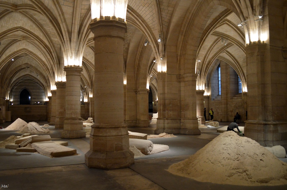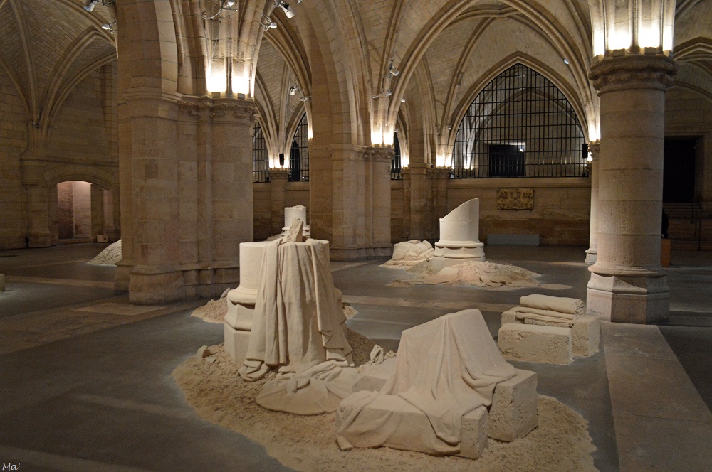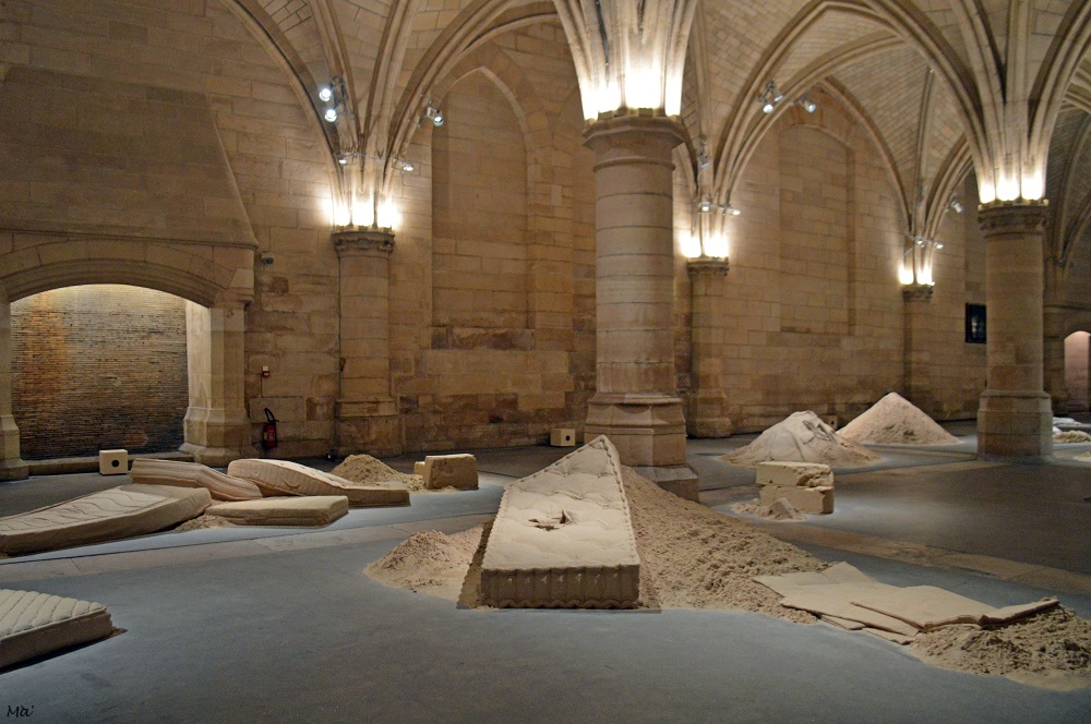Nous avons aussi beaucoup apprécié l’histopad prêté pour la visite. Ce dispositif de médiation numérique permet de visualiser les salles telles qu’elles étaient à différentes époques de l’histoire en mode « réalité virtuelle », mais aussi de se déplacer dans des salles inaccessibles ou aujourd’hui disparues. La cinématique, proche de celle d’un jeu vidéo, est très attractive et ludique. Enfin, une installation temporaire d’art contemporain était présentée dans la grande salle. Entre les piliers et sous les voûtes gothiques, des sculptures de sable ont été créées. Leur couleur se confond avec celle de la pierre. Leur réalisme est bluffant. Piliers effondrés, couettes et matelas, chiens de garde sommeillant nous plongent dans ce Sleeping Chapter du tryptique Outremonde de Théo Mercier. Nous sommes restées un long moment à admirer l’ensemble, aux frontières entre rêves et réalité.