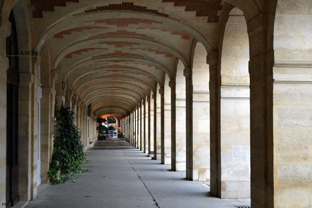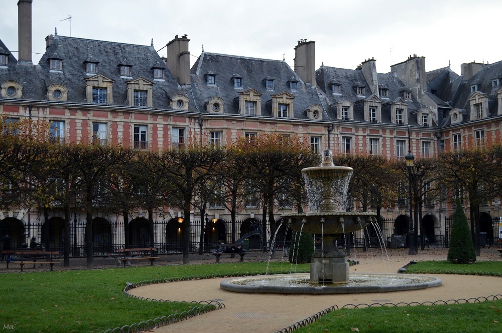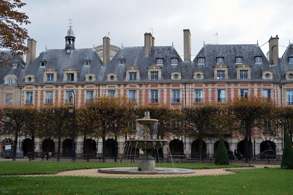 Nous avons ensuite jeté un œil au port de l’Arsenal, un endroit assez peu connu des touristes et que j’aime bien. Au pied de la colonne de Juillet, le bassin de l’Arsenal fait la jonction entre la Seine et le canal Saint Martin. Ancien port de marchandises, c’est maintenant un port de plaisance. Puis, nous avons traversé la place de la Bastille en direction du Marais. Je souhaitais en effet montrer à Melle 3e la place des Vosges, qui est pour moi la plus belle place de Paris (elle est d’ailleurs la place la plus ancienne de la ville). Comme il était encore tôt, les commerces n’étaient pas ouverts et nous avons pu profiter du calme dans le square central. Nous avons ensuite fait un tour dans les rues adjacentes, admirant quelques jolies façades au passage.