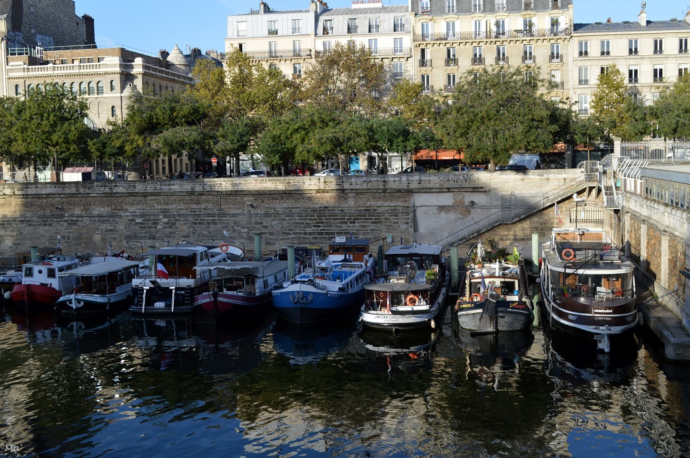Au bord de la place de la Bastille, le port de l’Arsenal et ses bateaux à l’amarrage