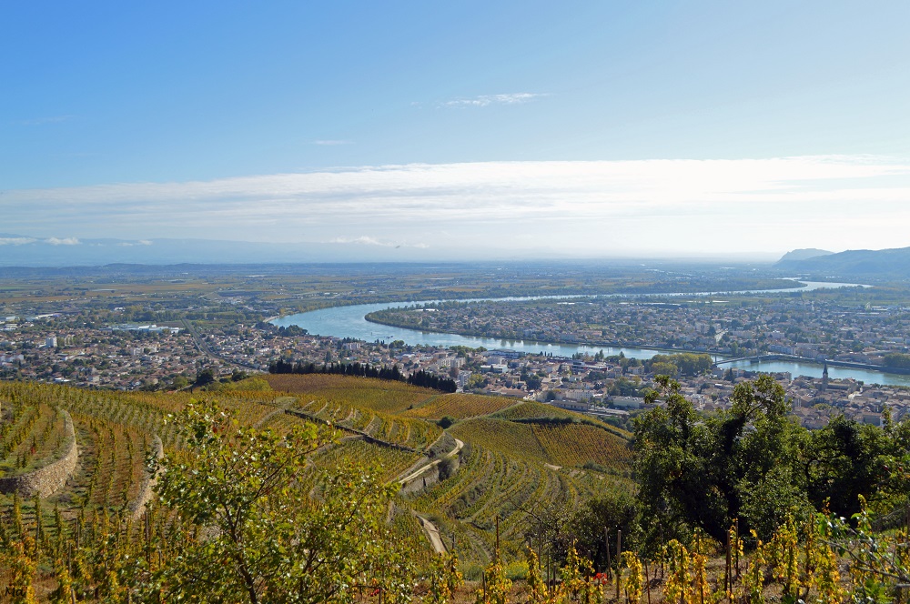 Le temps s’écoule en douceur. Une personne joue de la guitare un peu plus loin. L’été semble vouloir se prolonger en dépit du changement des couleurs. Je m’assoie au soleil. Je contemple le Rhône qui déroule son ruban entre les vignes de l’Hermitage et celles de Saint Joseph face à moi. Je le suis des yeux partant vers la montagne de Crussol. Je me demande s’il est possible de se lasser d’un tel paysage.. et je finis par conclure que ce n’est pas près de m’arriver quoi qu’il en soit !