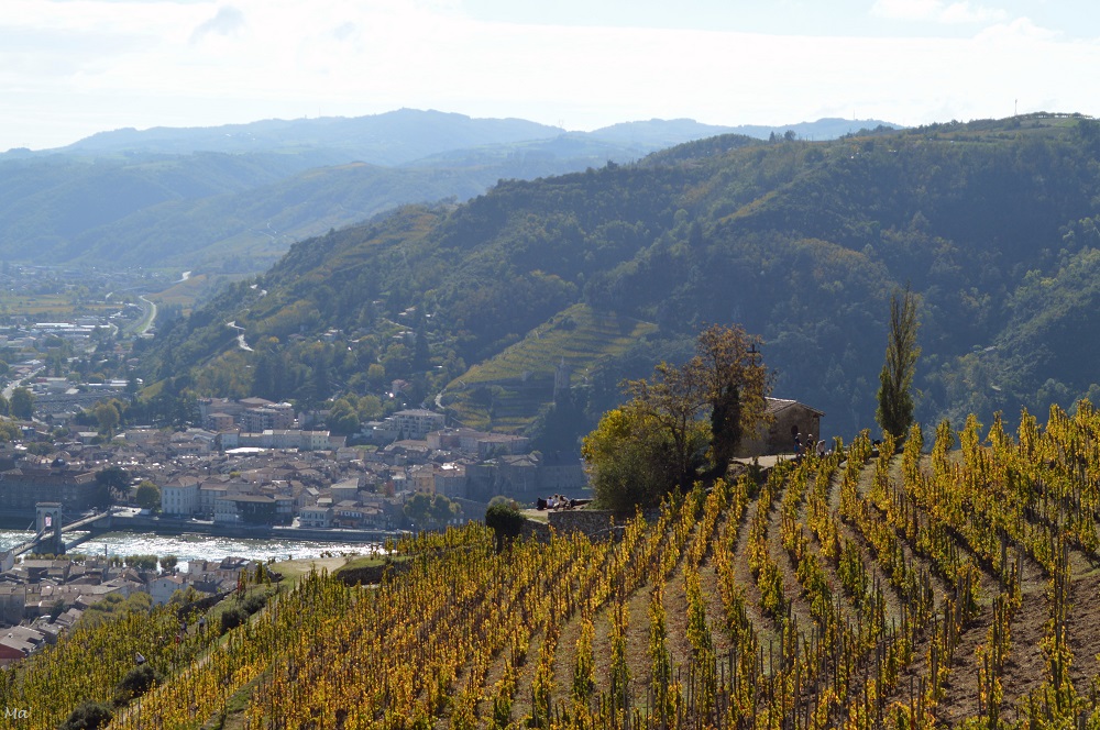 Les arbres tardent à perdre leurs feuillages mordorés cet automne, et les paysages restent encore très colorés. Fin octobre, j’ai voulu profiter d’une très belle journée pour aller randonner autour du belvédère de Pierre Aiguille, au dessus de Tain l’Hermitage. Malheureusement, une chasse était en cours sur le coteau, et il aurait dangereux de s’y risquer. Puisque j’étais déjà quasiment arrivée au parking lorsque je l’ai vu, j’ai décidé de plutôt partir à pied dans l’autre sens, sur la colline de l’Hermitage.