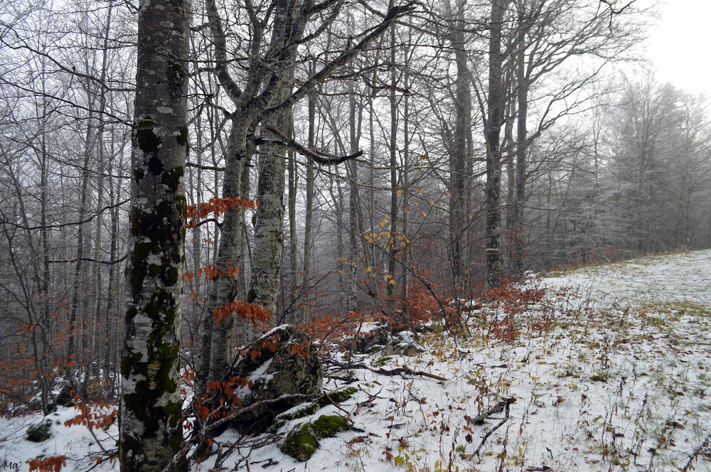En début d’après-midi, nous avons donc pris la route vers Font d’Urle. Nous ne nous attendions pas à ce qu’elle soit tombée plus près dans le Vercors compte-tenu du grand soleil dans la plaine de Valence. Aussi, nous avions choisi de passer par la route du Col de la Bataille (qui ferme aux premières neiges). En montant par le col des Limouches et sur le plateau de Léoncel, le soleil brillait, les couleurs des arbres étaient lumineuses : l’automne se déployait dans toute sa splendeur (et après coup, je regrette un peu de ne pas avoir pris le temps de faire un arrêt photo mais nous devions avoir encore un peu de route à faire..).