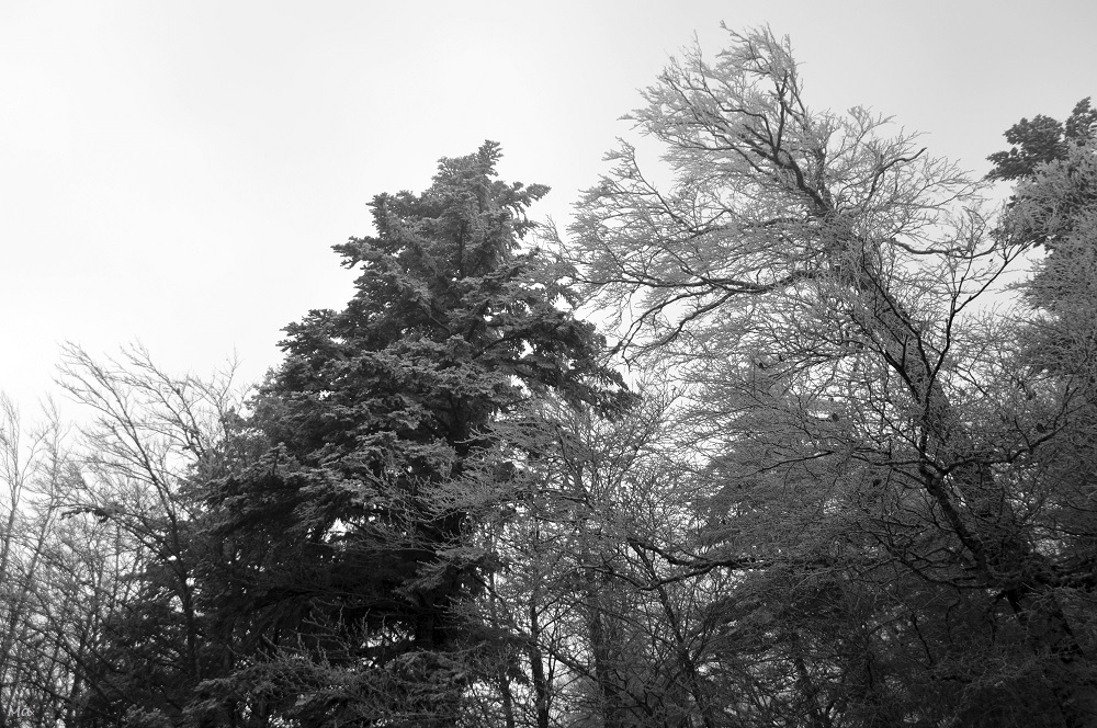 A la première possibilité, j’ai arrêté la voiture sur une zone de stationnement. Autour de nous, la forêt était couverte de neige et de givre. J’aime beaucoup l’effet des premières neiges de la saison. Elles me ramènent en enfance (à l’époque où même en Bretagne, nous avions chaque hiver au moins un jour ou deux de neige… et ces jours-là, nous en profitions largement !).