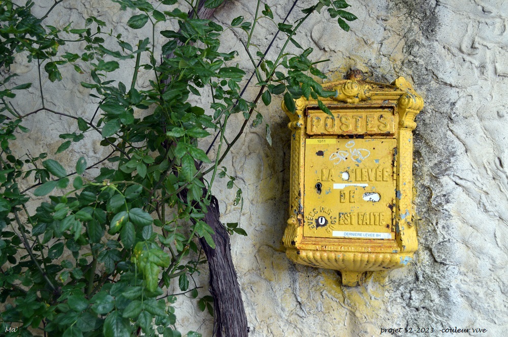 Puis, je me suis souvenue que j’aime bien envoyer des cartes postales lors de mes vacances…. et que les boîtes aux lettres de La Poste sont généralement d’un beau jaune vif. Il me restait à en trouver une avec un joli environnement. J’ai eu la chance de croiser celle-ci sur un mur de La Motte Chalancon, dans le Diois Provençal (j’essaie d’ailleurs de vous préparer un article d’ici la fin de l’été sur ce joli secteur de la Drôme). Et non seulement, elle était posée sur un mur avec une jolie végétation, mais en plus il s’agissait d’un ancien modèle très esthétique (pour les plus curieux, c’est une boîte aux lettres en fonte de type Mougeotte, déployée au tout début du XXe siècle).