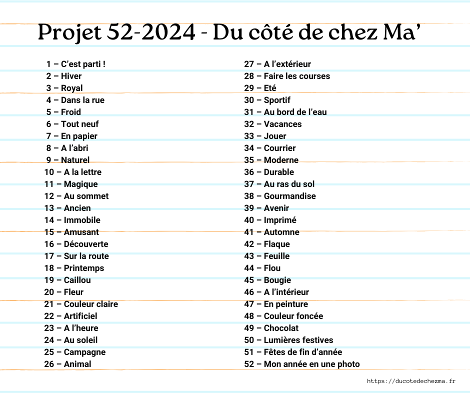 Je sais que 2024 sera tout aussi intense que 2023 (avec en prime de nouveaux challenges), et que j’aurais donc probablement encore trop peu de temps à accorder au projet 52. Mais, je sais que vous aimez ce rendez-vous du samedi, et j’avais envie de continuer avec vous cette jolie dynamique. Alors, après avoir pesé le pour et contre entre arrêter et continuer, je suis ravie de vous présenter les thèmes pour l’année 2024 du projet 52 du côté de chez Ma’ !