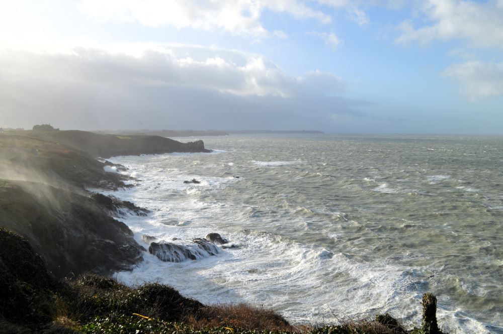 Les embruns sont poussés par dessus les falaises, pourtant hautes d’une quarantaine de mètres