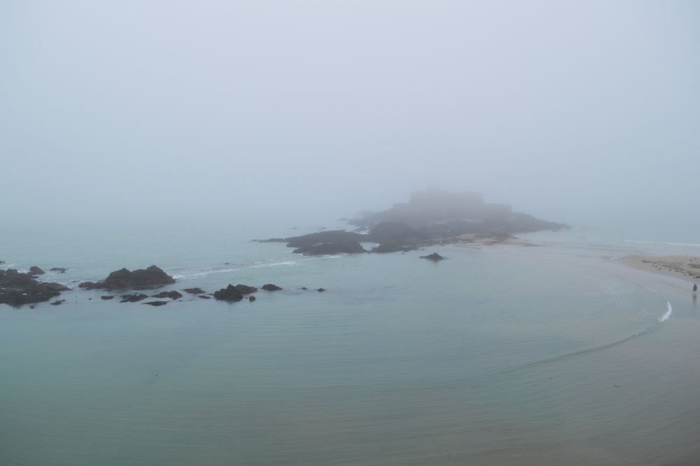 Le brouillard se dissipe légèrement, laissant apercevoir le rocher de Grand Bé et le fort de Petit Bé