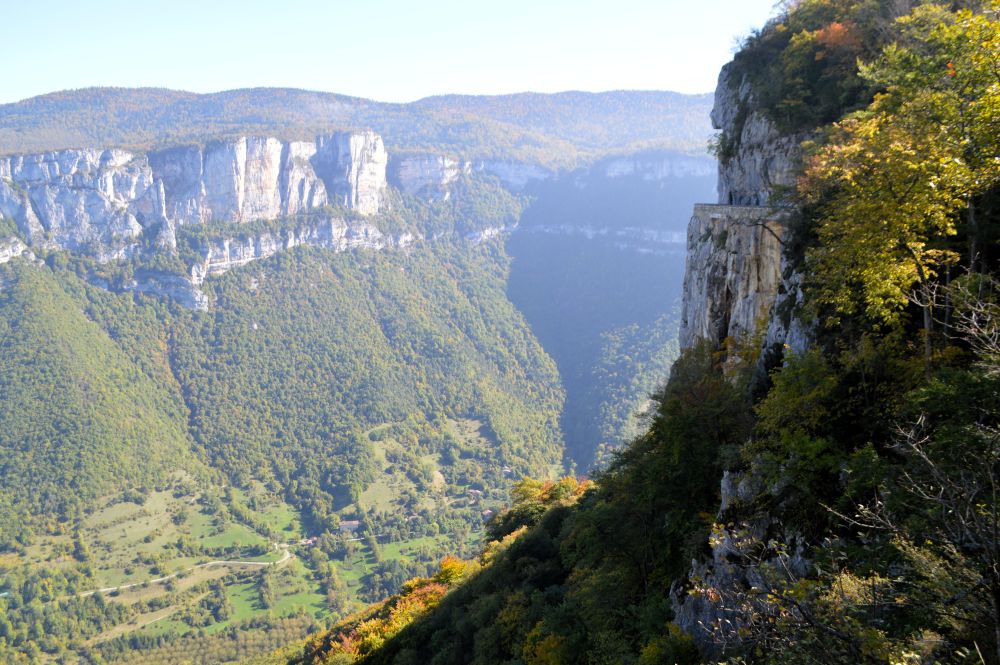 La route suit les contours des falaises de la reculée de Combe LavalDepuis la route, les points de vue sur les falaises de la montagne de l’Arps se multiplient