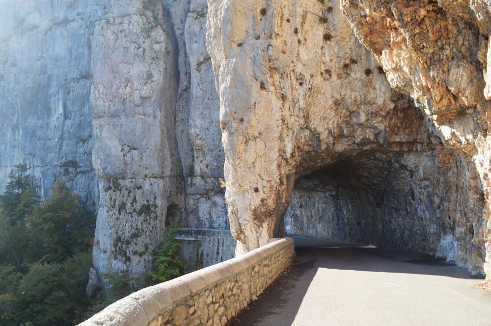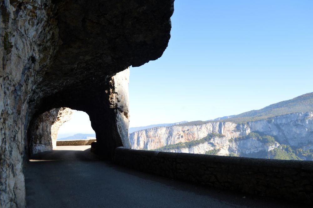 Cette fois, je l’ai donc parcourue à pied pour pouvoir profiter de la vue tout au long des un peu plus de 3 kilomètres de montée (je me suis arrêtée avant le dernier tunnel, un peu long et que je ne souhaitais pas emprunter à pied sans équipement de visibilité). Nous étions un samedi matin, et il y avait finalement assez peu de circulation. J’ai essentiellement croisé des vélos et des motos. J’ai aussi eu la chance de ne pas avoir de grosse pierre qui dévale la falaise au moment où je passais. Nous n’étions pas dans une période à fort risque (je n’irais pas à pied par là au moment du dégel ou après de fortes pluies qui font éclater la roche calcaire), même si j’ai entendu quelques petits cailloux tomber.
