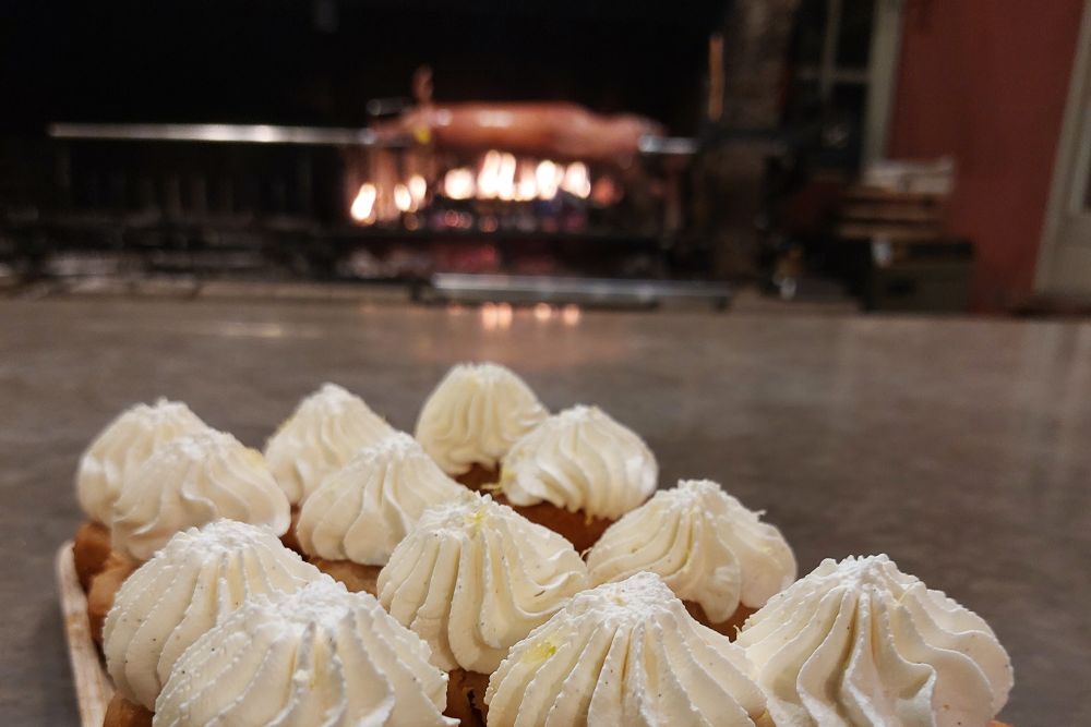 A l’auberge de Crussol, les viandes sont cuites au feu de bois. Au premier plan, l’un des délicieux desserts préparés en utilisant un des thés de chez Soïo.