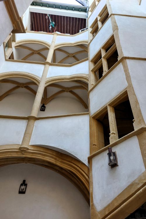 Tout en haut de l’escalier, au dessus du dernier étage, on trouve le miradorA l’angle de la rue Saint Jean et de la place Neuve Saint Jean, percée pour aérer le quartier et limiter les impacts des épidémies de pesteLe puits de la cour de la Tour RoseLe puits de la cour de la traboule de l’Hostellerie du Gouverneur