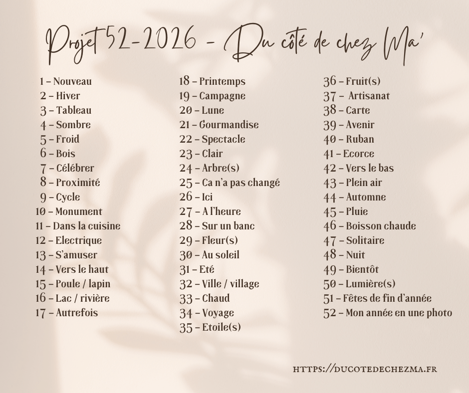 Ca y est, l’année 2026 a débutée. Avec elle, j’ai décidé de repartir pour une nouvelle année de projet 52. Je ne me fais pas d’illusion, et je sais que, tout comme en 2025, il y a aura des semaines où je ne pourrai passer voir vos participations que bien après la fin du week-end. Mais, je sais aussi que j’apprécie de vous retrouver au fil des samedis (et je vous remercie d’ailleurs d’être toujours aussi motivés ! ), et que j’ai envie de continuer dans cette belle dynamique qui vient rythmer les fins de semaine. Donc, je suis ravie de vous présenter les thèmes pour l’année 2026 du projet 52 du côté de chez Ma’ !