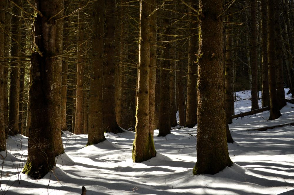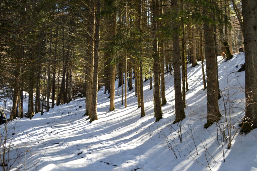 J’avoue que je ne pensais pas trouver encore autant de neige, surtout que je suis encore assez bas. Mais le chemin est sur un versant exposé au nord et cela se sent. La couche de neige est peu épaisse, très tassée mais surtout verglacée. La prudence est donc de mise. Le soleil déjà haut, traverse les branches des arbres pour venir déposer des jeux d’ombres sur la neige. C’est doux et poétique. En contre bas du chemin, j’entends le ruisseau chanter. C’est calme et apaisant.