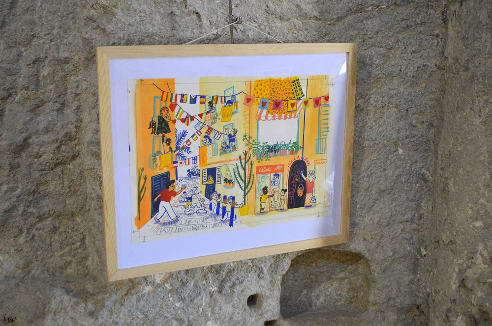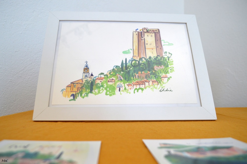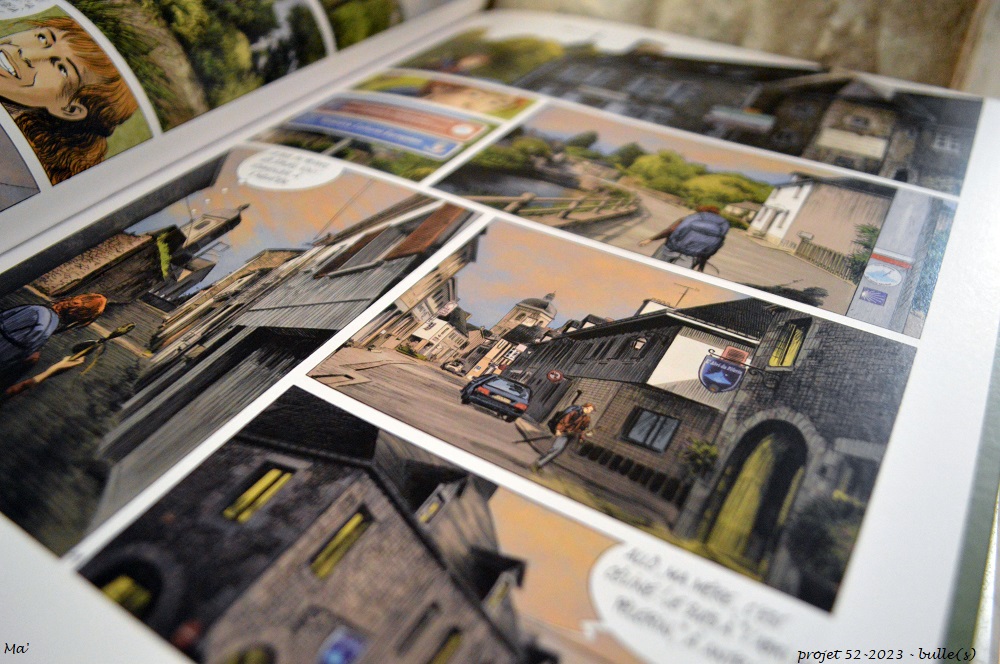 Il me restait donc les bulles de bande dessinée. J’aime bien lire des bandes dessinées, même s’il y a des styles auxquels je n’ai pas accroché du tout (par exemple les mangas dont je sais qu’il en existe d’excellents et dont mes enfants sont tous de grands lecteurs… je n’arrive pas à apprécier le style du dessin, et ça m’empêche d’apprécier le fond). J’en possède un certain nombre dans ma bibliothèque. Il restait donc à choisir comment les montrer ou quel album présenter. Finalement, mon choix s’est porté sur un album que j’ai depuis assez longtemps : le tome 2 des Chemins de Compostelle de Servais. Dans cet opus, une page de l’action se situe dans le village de mon enfance, et j’aime la façon dont cela a été dessiné, avec pléthore de détails. On y voit même la maison de mes parents !