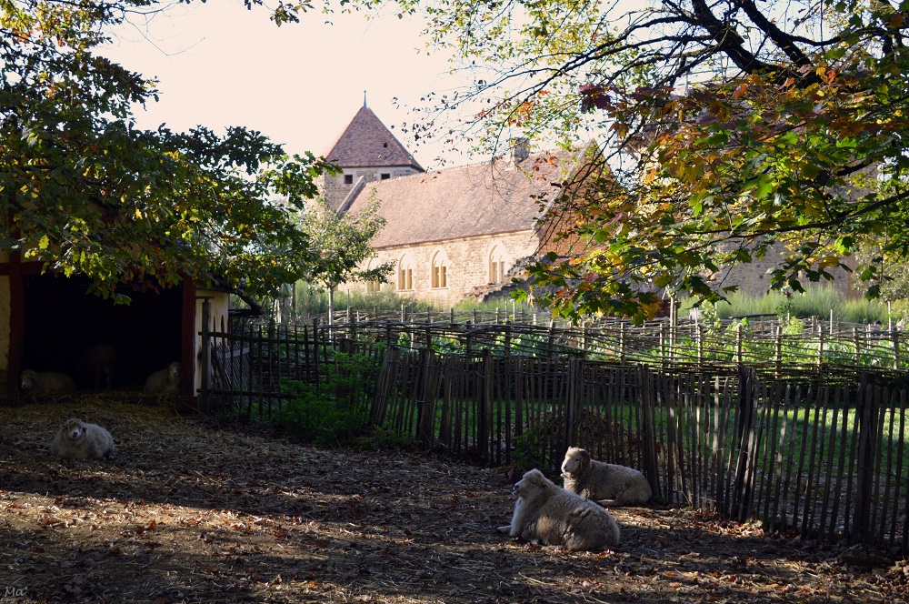 Après la visite de la saline royale d’Arc et Senans, je me suis enfoncée dans le Jura. J’ai pris la direction du village de Baume les Messieurs. En chemin, j’ai traversé de très beaux paysages, en particulier les vignobles du vin jaune autour d’Arbois. J’ai aussi vu pas mal de vaches dans les champs de cette région productrice du Comté. Je ne m’y suis toutefois pas attardée car je tenais à avoir le temps de profiter de Baume les Messieurs avant de redescendre dans l’Ain. Le village s’est développé autour d’une abbaye bénédictine, fille de l’abbaye bourguignonne de Cluny. Arrivée à l’heure du déjeuner, j’ai laissé ma voiture sur l’un des parkings extérieurs au village et j’ai traversé la petite rivière avant de trouver de quoi manger et un coin d’ombre.