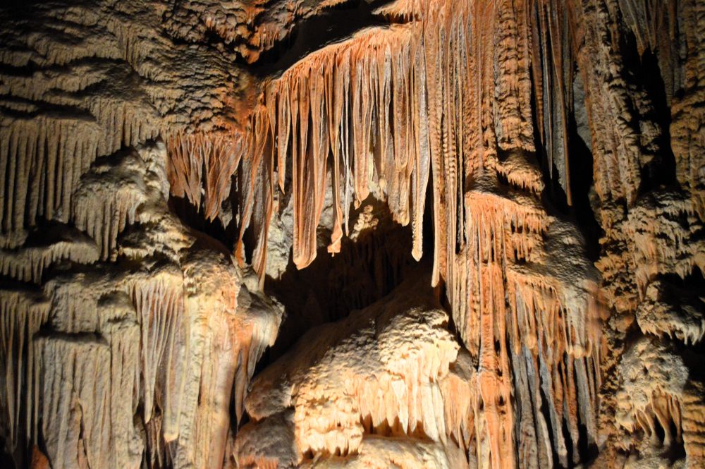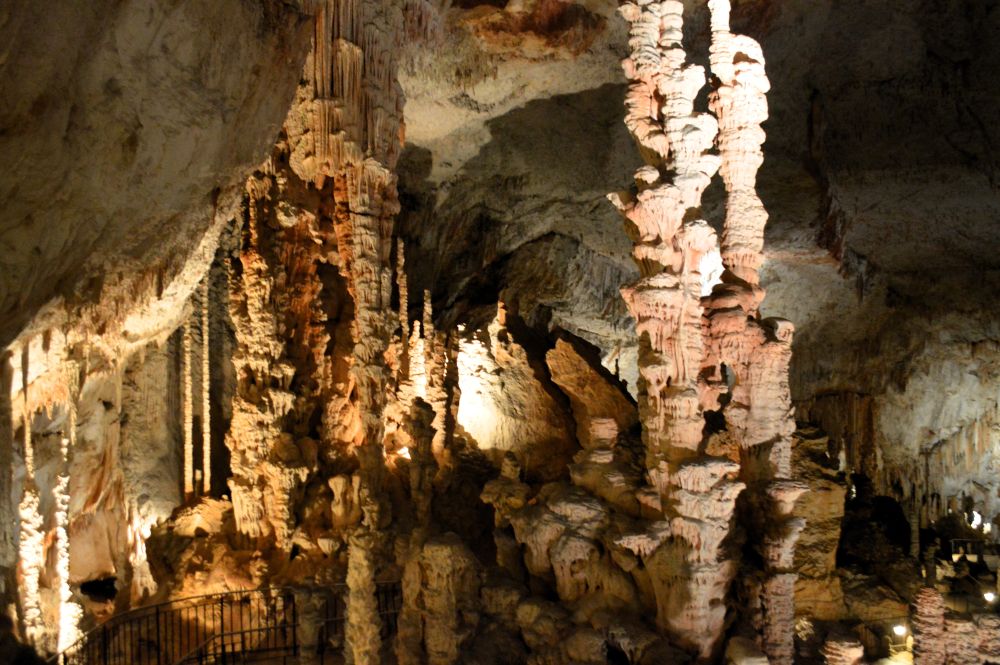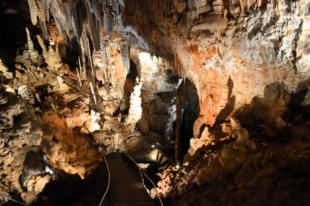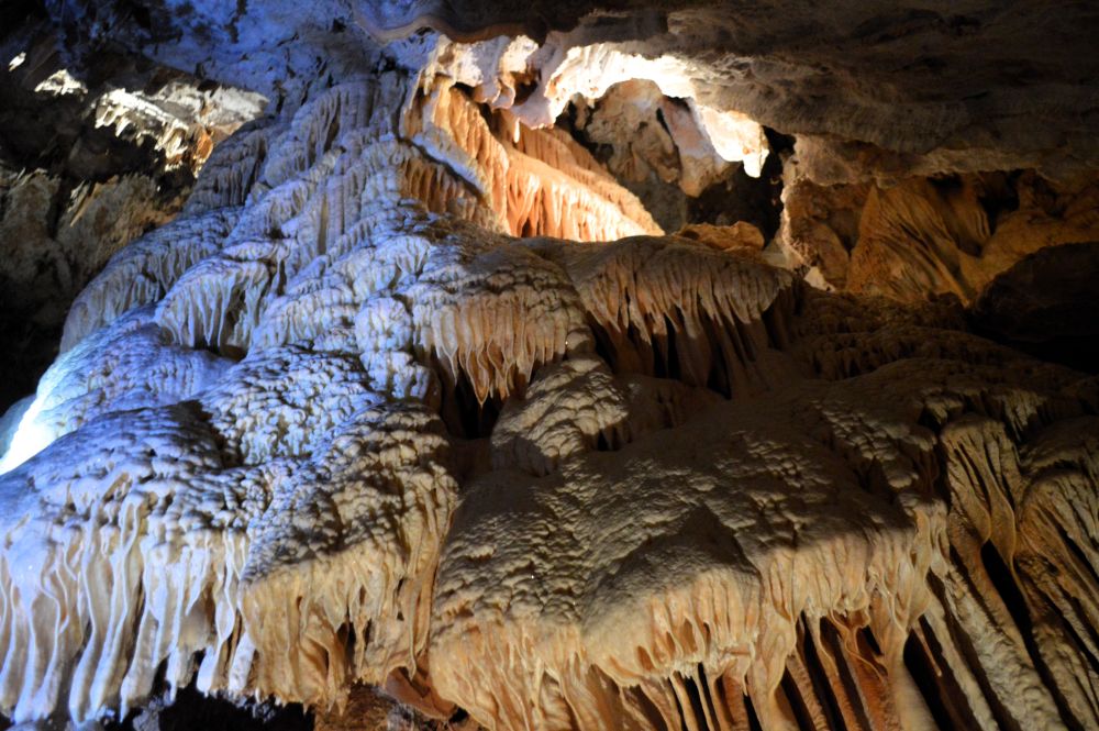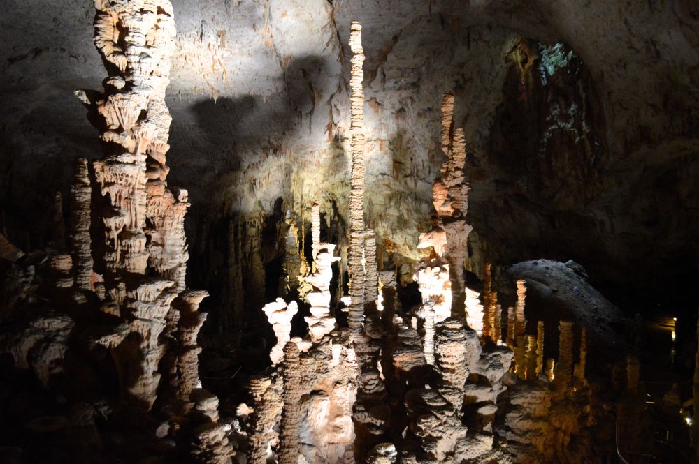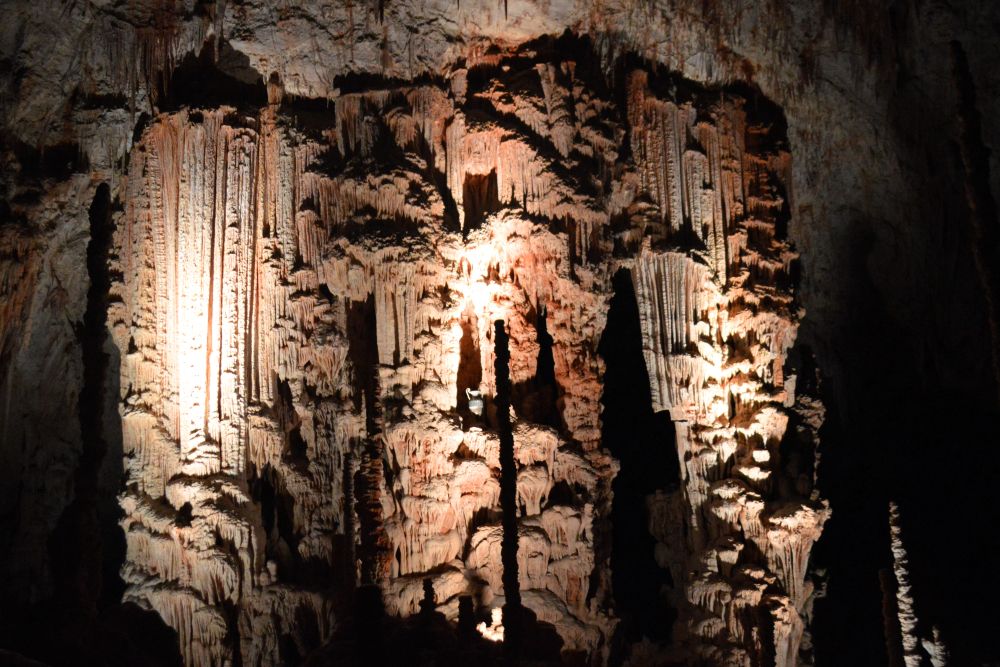 Nous continuons notre périple souterrain, tandis que notre guide nous explique comment la grotte s’est formée ainsi que l’histoire de sa découverte et de son aménagement au début du XXe siècle. La descente se poursuit au fil des salles. Partout où le regard se pose, les sculptures naturelles sont impressionnantes par leur taille et magiques par leurs détails. Moi qui aime les découvertes souterraines, je suis sous le charme. Stalactites, stalagmites, draperies, piliers : tout semble démesuré. Nous pouvons même admirer l’eau au travail. A plusieurs endroits, les gouttes tombent du plafond sur une stalagmites en produisant un splash dans la petite flaque au sommet. Le spectacle est hypnotisant.