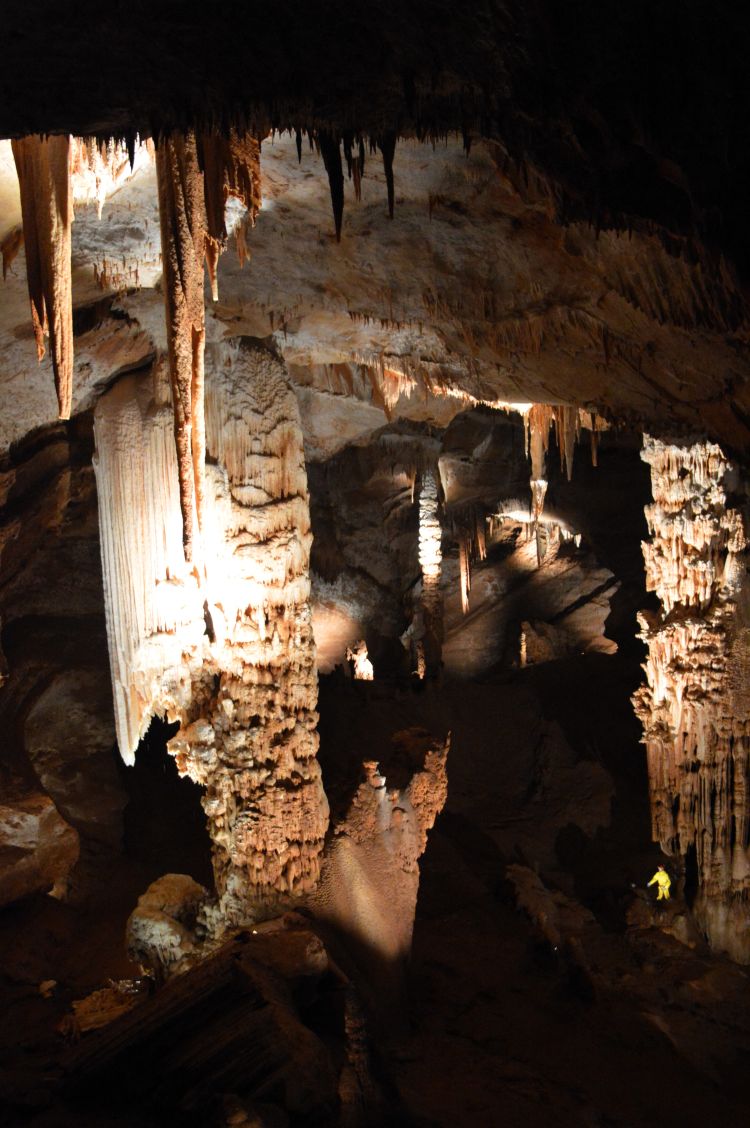 Nous arrivons au bout des 700 marches. Nous sommes 120 mètres sous la surface. La dimension des salles est toujours aussi impressionnantes. Dans le fond, un mannequin de taille adulte nous donne une idée de l’échelle : nous sommes clairement minuscules dans ce monde souterrain exceptionnel. Avant d’assister au son et lumière qui anime la dernière salle, le guide nous fait expérimenter l’écho des lieux en nous invitant à lancer tous ensemble un hé-ho. Celui-ci reste suspendu dans les airs durant de longues secondes. Après le spectacle, la visite s’achève. Cela fait bientôt 1 heure et demie que nous avons pénétré dans cet univers souterrain (normalement, la visite est annoncée pour durer 1 heure, mais notre guide nous a permis de prendre notre temps car nous étions peu nombreux et le seul groupe présent dans la grotte ce matin-là). Il est temps de remonter à la surface en empruntant les ascenseurs.