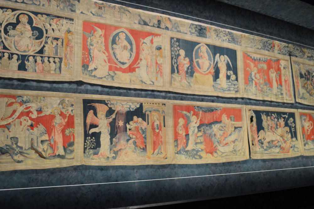 Après ces mises en bouche, nous sommes parties à la découverte de la tapisserie de l’Apocalypse. J’avais déjà (vaguement) entendu parler de cette tapisserie médiévale, et je m’attendais à quelque chose un peu dans le style de la tapisserie de la Dame à la Licorne que j’avais vue au Musée de Cluny à Paris. En entrant dans la galerie qui lui est dédiée, j’ai déjà trouvé la tapisserie de l’Apocalypse immense, bien plus grande que tout ce que j’avais pu imaginer. Mais (et oui, il y a un mais), je n’étais pas au bout de mes surprises car je n’avais pas vu que la galerie faisait un angle et que la tapisserie continuait sur l’autre pan, encore plus long. Je crois que j’ai été tellement stupéfaite que je n’en ai même pas lâché une exclamation. En même temps, j’aurais du m’y attendre car les chiffres ne mentent pas : la tapisserie de l’Apocalypse telle que nous la connaissons aujourd’hui (et dont on sait qu’il manque des panneaux) mesure plus de 100 mètres de long !