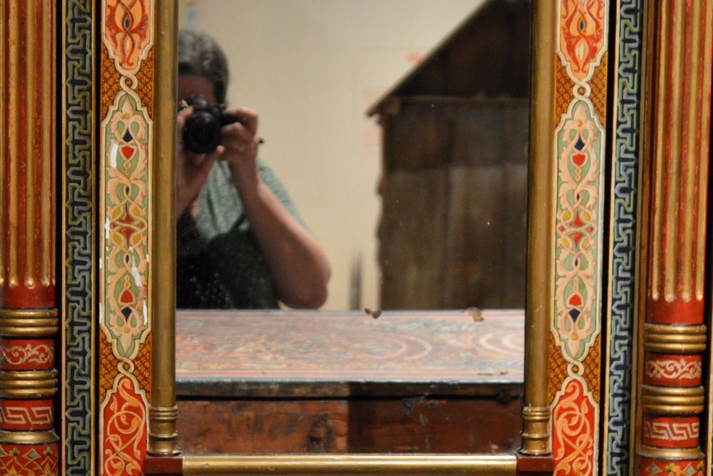 A l’heure dite, notre guide est venue nous chercher au point de rendez-vous. Elle a commencé par nous donner quelques consignes car la maison est encore en chantier. Nous avons d’ailleurs croisé des ouvriers lors de la visite. Toutes les pièces ne sont pas sécurisées et les lieux sont exigus. Sans être inintéressante, la visite de la bastide n’est pas non plus exceptionnelle (du moins à ce jour alors que les travaux de restauration ne sont pas achevés). J’ai malgré tout trouvé intéressant de voir le grand salon dont Paul Cezanne avait décoré les murs à même le plâtre. Ces « fresques » ont ensuite été en partie vendues à la découpe quand la maison a changé de propriétaires. Nous en avions vu quelques morceaux le matin, et les découvrir projetées à leur emplacement réel était intéressant. Parmi les autres pièces visitées, il y la cuisine provençale restaurée dans son état du XVIIIe siècle (avant donc l’achat de la bastide par les Cezanne), et la chambre de Léda, dont les décors de gypserie ont inspiré Paul Cezanne. Enfin, la visite se termine par l’atelier que le père de Paul Cezanne lui avait fait installer au dernier étage avec son immense verrière.