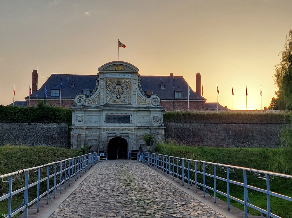 Le canal de la Moyenne Deûle qui assure l’encerclement du site militaire par des cours d’eau, rendant son accès plus complexe pour un ennemiSoleil couchant sur la Porte Royale