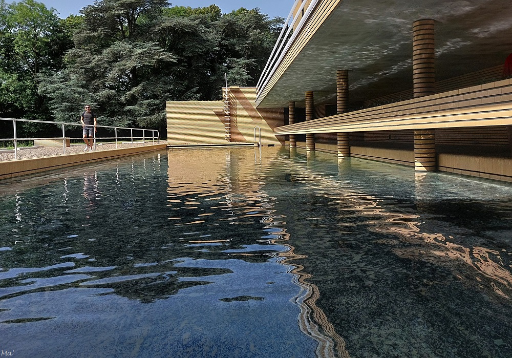 Après avoir parcouru les intérieurs, nous nous dirigeons vers le parc. En chemin, nous faisons une halte au bord du bassin de nage (où, compte-tenu de la chaleur, nous ne serions pas contre un petit bain…). Puis, nous allons jusqu’au bout de la perspective dessinée par le grand bassin du jardin afin de contempler le reflet de la villa dans le miroir d’eau…