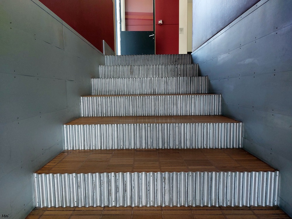 Avec son miroir d’eau, le bâtiment aixois de la fondation Vasarely est imaginé comme un château contemporainLa cafétéria entre l’aluminium et les tons gris du skaï des fauteuils semble sortie d’un décor de film futuriste des années 1960L’escalier à double révolution est une interprétation contemporaine de celui du château de Chambord
