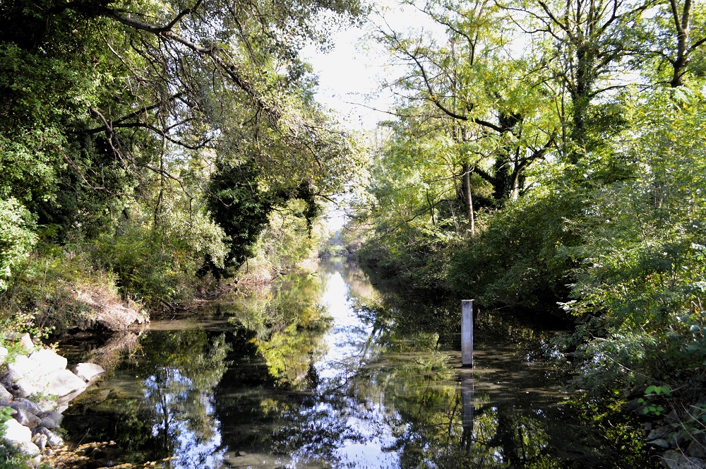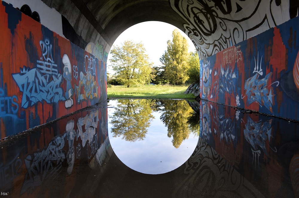 Cette fresque m’a aussi permis de m’amuser avec les reflets. En effet, suite aux grosses pluies des jours précédents, une immense flaque s’étalait sous l’intégralité de l’arche… et la lumière était parfaite pour refléter non seulement les dessins mais aussi les arbres situés un peu plus loin.A quelques pas du pont, on est en pleine nature, le long des lônes du Rhône…