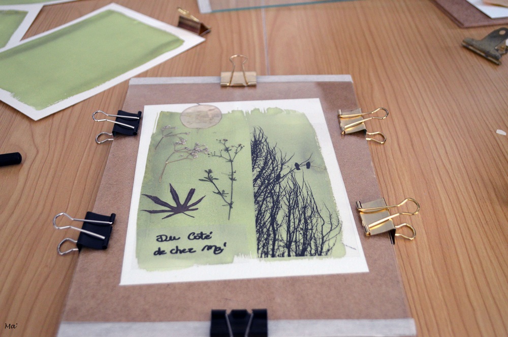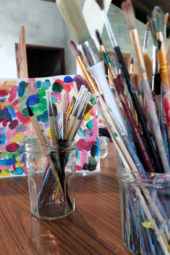 Après la visite, nous avons eu la chance de participer chacun à 2 ateliers. Nous avons fait un atelier d’art-thérapie, installés sous les arcades, en extérieur mais abrités de la pluie battante. Le but était de se focaliser sur les couleurs, le mouvement du pinceau ou de la brosse, et les effets produits, en particulier en superposant les couleurs ou ajoutant plus ou moins d’eau à la peinture acrylique, sans chercher à représenter quoi que ce soit. J’ai trouvé cet atelier très apaisant, très relaxant, et cet effet était décuplé par le bruit de la pluie. Puis, je suis allée dans l’atelier d’Ariane la potière pour une initiation au tournage de la terre. Après mon atelier modelage chez Amélie il y a un peu plus de deux ans, j’avais eu envie d’essayer le tour sans jamais en avoir l’occasion depuis. J’étais donc ravie de pouvoir le faire cette fois. Après la démonstration d’Ariane, c’est à notre tour de tourner un cylindre. Spoiler alert : ça semble beaucoup plus facile quand Ariane le fait ! Mais j’ai réussi à sortir un presque cylindre. J’ai vraiment aimé les sensations du contact de la terre lors du tournage, mais il va falloir que je m’entraîne si je veux sortir des pots dignes de ce nom.