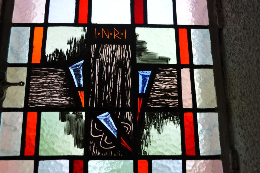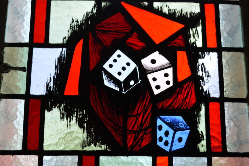 Quelques détails des vitraux : le Saint Suaire, les clous de la Passion, et les dés des soldats romains tirant au sort les vêtements du Christ
