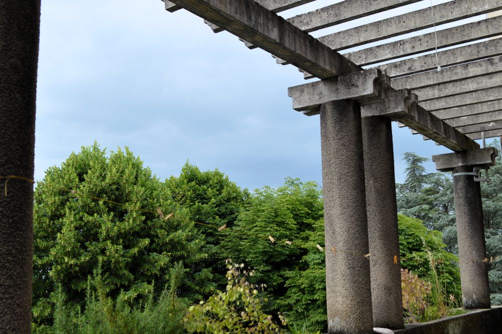 Parmi les éléments architecturaux remarquables, j’ai noté la terrasse avec sa pergola ainsi que la chapelle. Située au premier étage du bâtiment principal, ses fenêtres ont une forme originale et accueillent des vitraux au graphisme intéressant. Je n’ai pas (encore) réussi à trouver des informations à leur sujet, mais ils m’intriguent fortement.