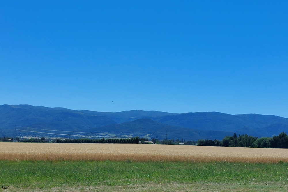 Voici donc le paysage tel qu’on peut le découvrir depuis les hauteurs de Mirmande, un village perché à une trentaine de kilomètres de chez moi mais où le dépaysement est déjà présent, où tout chante encore plus le Sud que chez moi, où la Provence se profile réellement…