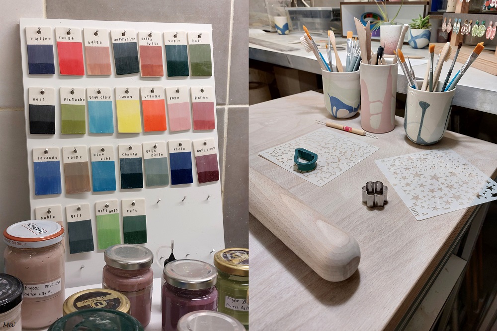 En passant dans la rue principale de Boffres, j’avais repéré une échelle exposant quelques poteries. C’est en effet là qu’Olivier Despert a installé son atelier. Nous voyant jeter un œil à la vitrine, il nous a proposé de rentrer. Nous avons eu un très chouette échange sur la céramique, son atelier encore en travaux ou encore la vie du village. Nous avons même découvert que nous avons habité à quelques centaines de mètres à une époque. Il nous a montré son four qu’il a lui-même installé et qui fonctionne au bois. C’est techniquement plus difficile pour avoir la bonne température qu’un four électrique : il faut en effet réussir à monter à 1300°C, en évitant les changements trop brusques de température et garder des flammes puissantes. J’ai eu un coup de cœur pour ses poteries en grès, et j’ai craqué sur une nouvelle tasse à café (en même temps, j’en ai ébréché une que j’ai depuis longtemps, il fallait donc songer à la remplacer).