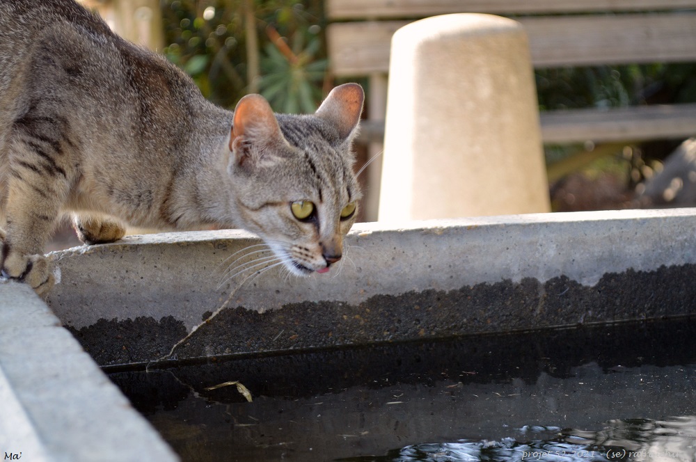 Mais finalement, c’est un petit chat croisé au centre équestre en fin de semaine dernière qui aura ma préférence. Alors que la journée se terminait et que la foule de l’après-midi était repartie, il a traversé tranquillement la cour puis il a sauté sur le bord de l’abreuvoir pour les chevaux afin d’aller boire… et se rafraîchir ! Il avait alors un petit côté « félin qui s’approche du point d’eau alors que le soleil décline » comme on peut le voir dans certains documentaires animaliers.