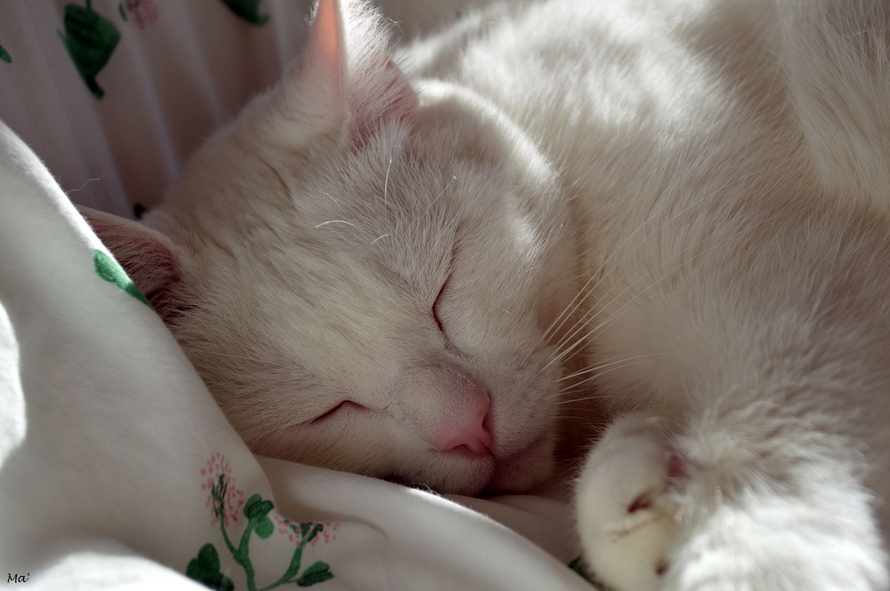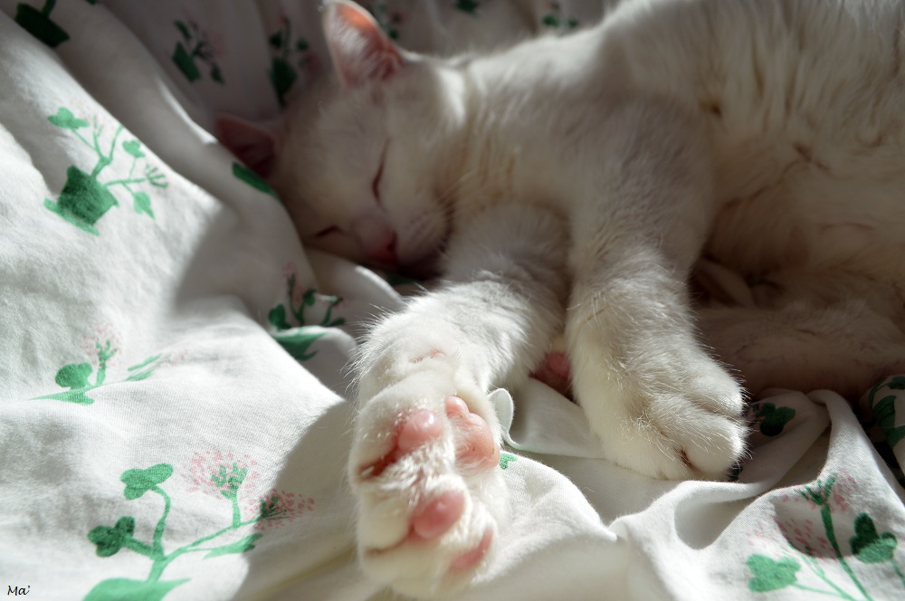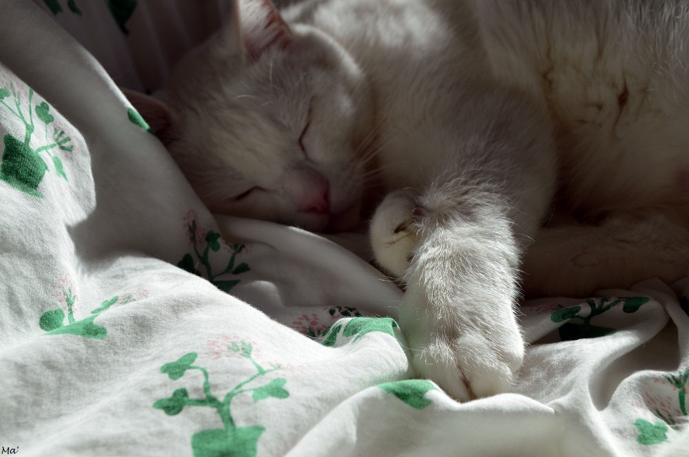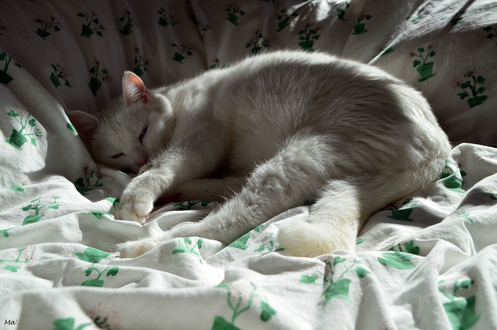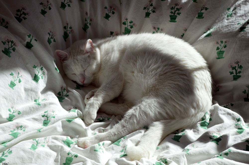 Depuis quelques semaines, le soleil est plus haut dans le ciel et il entre de nouveau directement dans la maison, au niveau du premier étage. Vador l’a bien compris et a très vite retrouvé les meilleurs endroits pour faire la sieste au soleil. Il commence sur le palier, là où les rayons du soleil font leur apparition en premier mais de façon assez brève. Puis il vient s’installer sur le lit qui présente le double avantage d’être confortable et de recevoir le soleil tout le début de l’après-midi !