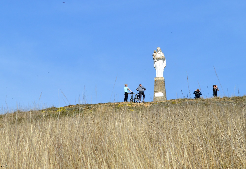 Très vite, le sentier quitte le couvert des arbres et monte à l’assaut d’une colline aux pentes couvertes de végétation rase. Partout autour de moi, des petites fleurs jaunes poussent sur la terre sèche. Je lève les yeux, et au pied de la Vierge du Vœu, j’aperçois un groupe d’ados à VTT. Certains scrutent le ciel avec jumelles et lunette d’observation. De là où je suis, la scène a de faux airs d’un remake de Stranger Things(même si je n’ai jamais entendu parler d’un laboratoire secret dans le secteur…).