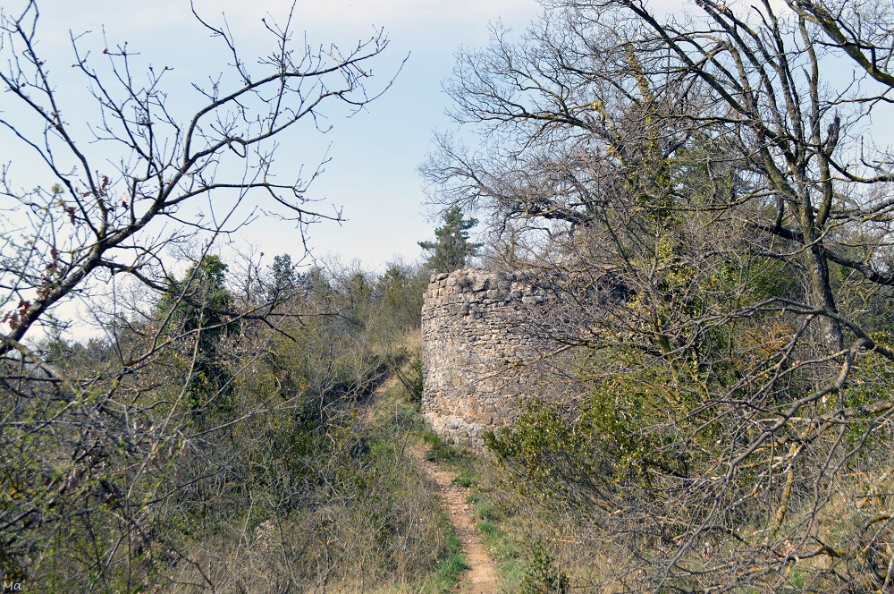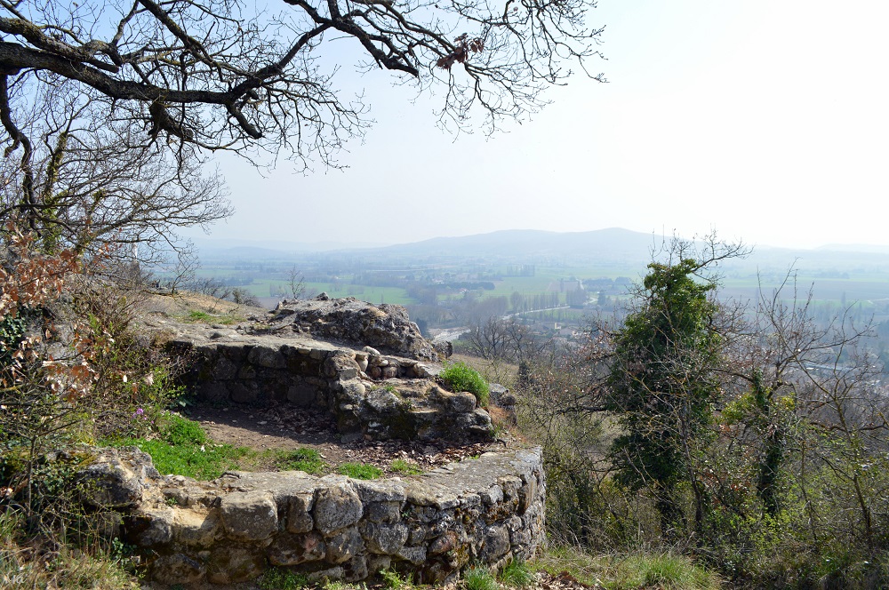 Alors que je m’apprête à redescendre, j’avise dans le sous bois voisin un vestige de mur arrondi. Je comprends alors pourquoi la rue que j’ai empruntée s’appelle « rue de la Tour ». Je suis à proximité des ruines de l’ancien château médiéval de Montmeyran… dont je ne savais pas qu’elles existaient ! Cependant, compte-tenu de la vue dégagée, je ne suis pas étonnée qu’un château ait été construit ici au Moyen-Âge.