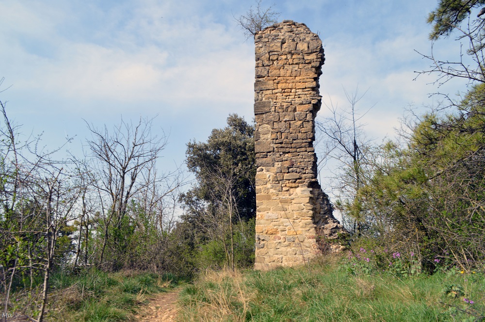 Je m’engage donc sur la petite sente qui conduit à la tour ruinée. De là, j’aperçois un pan de mur vertical un peu plus loin dans le bois, un peu plus haut que la tour également. Là encore, l’accès se fait via un petit sentier dessiné à travers la végétation. Si la tour avait des airs de construction défensive, ce mur semble avoir appartenu à une partie plus habitée de l’ancien château. (Il y a une autre tour que j’ai aperçue un peu plus bas sur la colline, à l’opposé du village, mais je n’étais pas chaussée pour une marche sur un sentier plus hasardeux et je n’y suis pas allée. Après quelques recherches sur internet, il semblerait que cette 3e tour soit sur une propriété privée de toutes façons.)